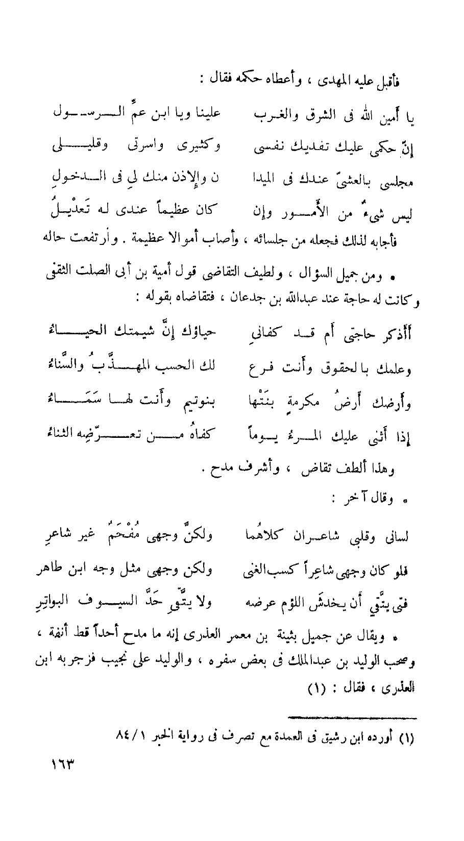 ويقال عن جميل بينة بن معمر العذري إنه ما مدح أحداً قط أنفة، وصحب الوليد بن عبد الملك في بعض سفره، والوليد على نجيب فزجر به ابن العذري، فقال: