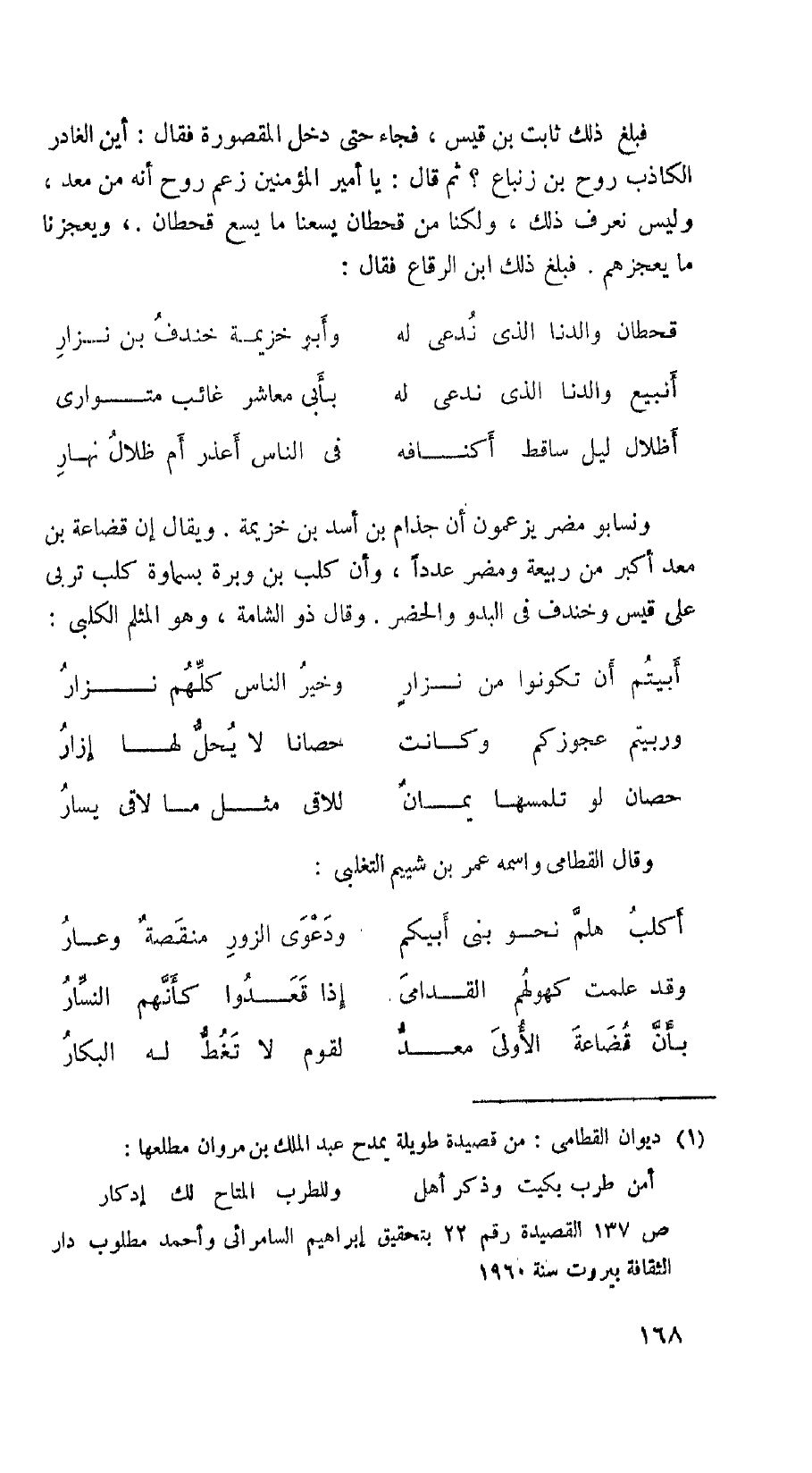 ونسابو مضر يزعمون أن جذام بن أسد بن خزيمة. ويقال إن قضاعة بن معد أكبر من ربيعة ومضر عدداً، وأن كلب بن وبرة بسماوة كلب تربى على قيس وخندق في البدو والحضر. وقال ذو الشامة، وهو المثلم الكلبي: