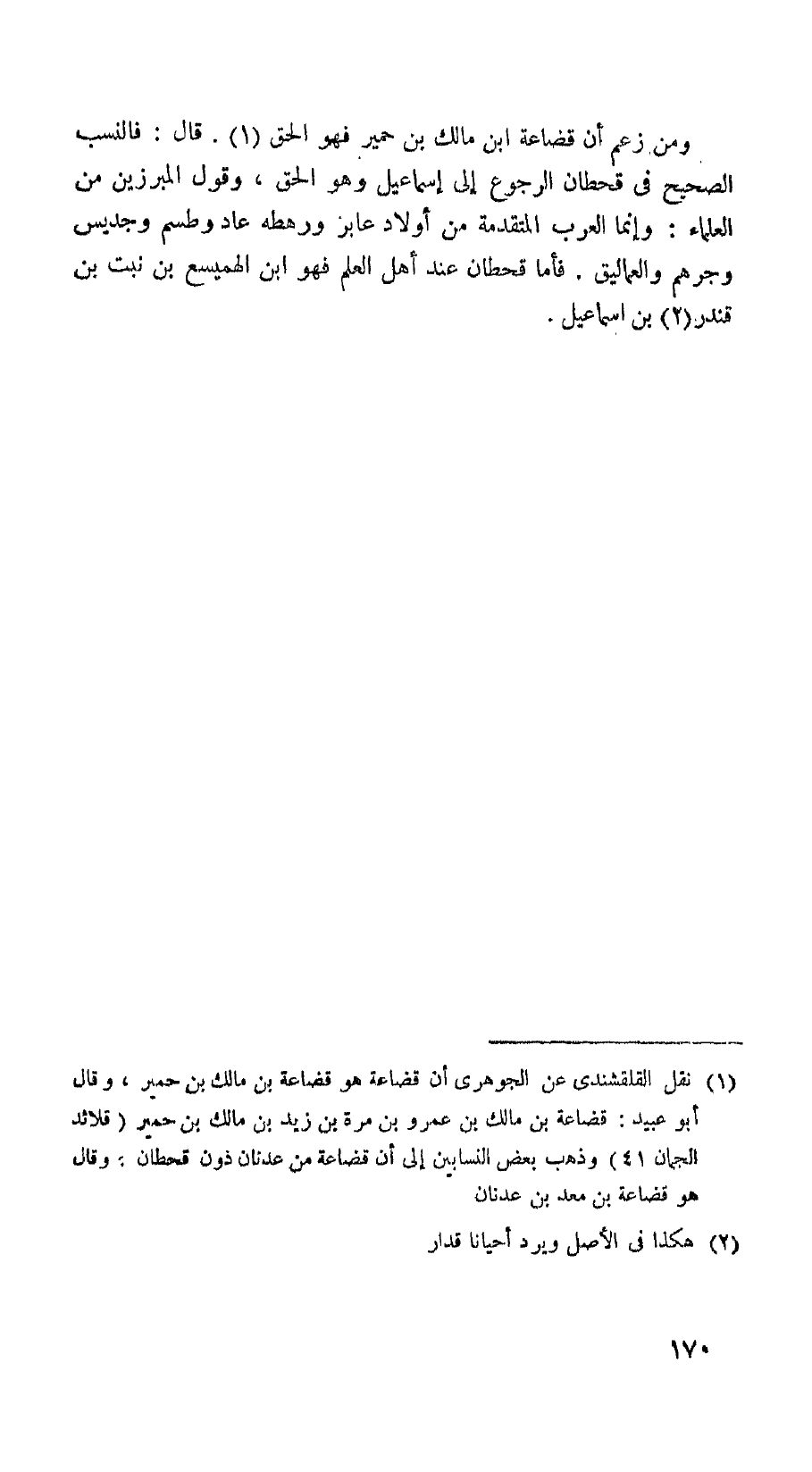 ومن زعم أن قضاعة ابن مالك بن حمير فهو الحق. قال: فالنسب الصحيح في قحطان الرجوع إلى إسماعيل وهو الحق، وقول المبرزين من العلماء: وإنما العرب المتقدمة من أولاد عابر ورهطه عاد وطسم وجديس وجرهم والعماليق. فأما قحطان عند أهل العلم فهو ابن الهميسع بن نبت بن قندر بن إسماعيل.