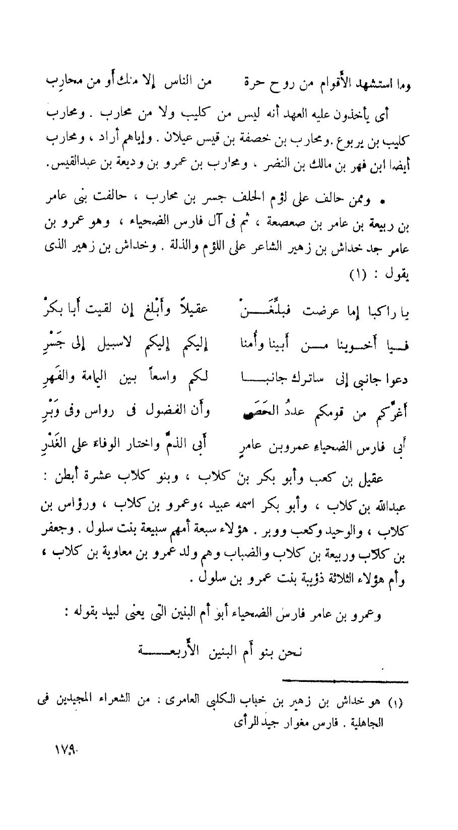 وممن حالف على لؤم الحلف جسر بن محارب، حالفت بني أمر بن ربيعة ابن عامر بن صعصعة، ثم قال في آل فارس الضحياء، وهو عمرو بن عامر جد خداش ابن زهير الشاعر على اللؤم والذلة. وخداش بن زهير الذي يقول: