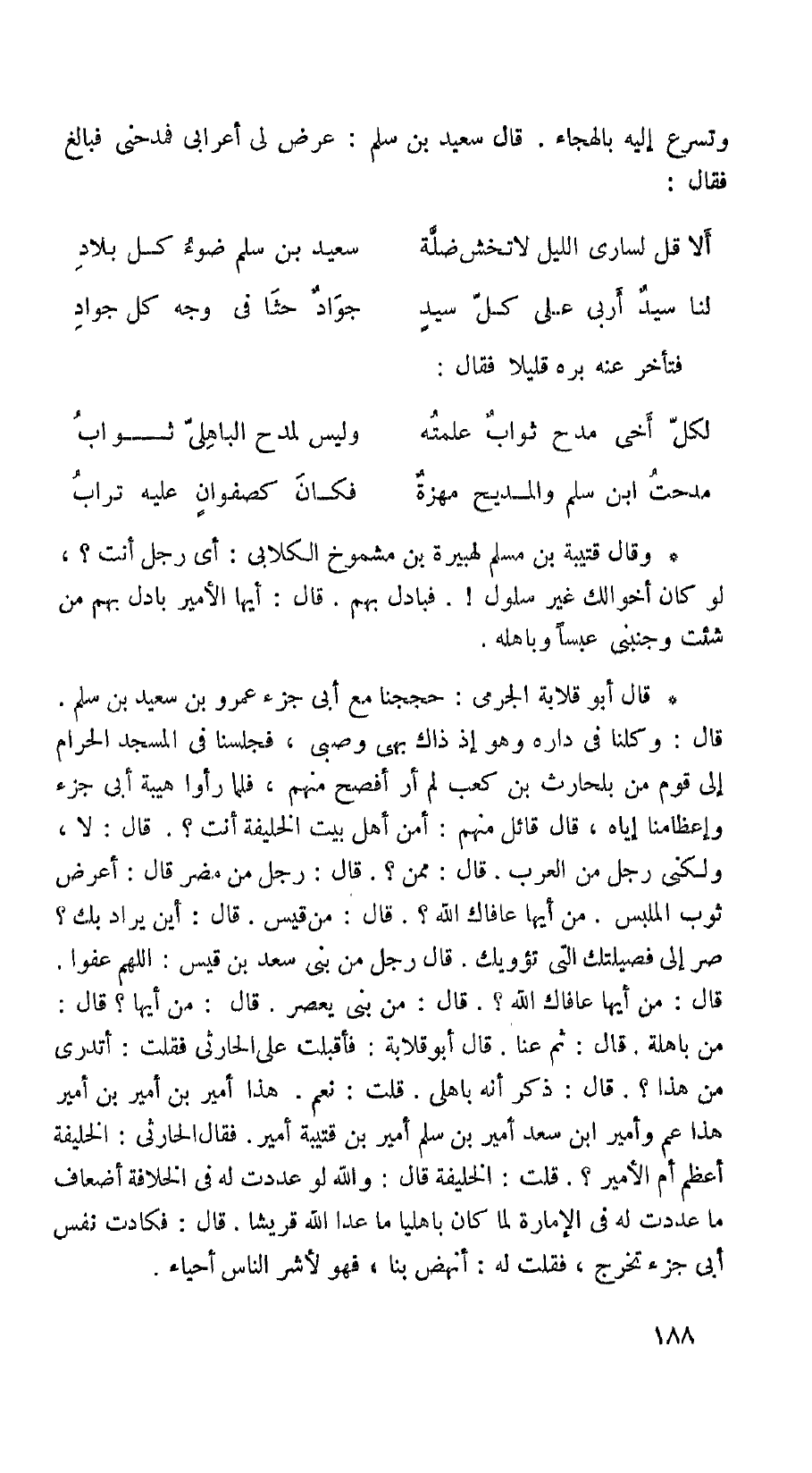 قال: من قيس. قال: أين يراد بك؟ صر إلى فصيلتك التي تؤويك. قال رجل من بني سعد بن قيس: اللهم عفوا. قال: من أيها عافاك الله؟ قال: من بني يعصر. قال: من أيها؟ قال: من باهلة. قال: ثم عنا. قال أبو قلابة: فأقبلت على الحارثي فقلت: أتدري من هذا؟. قال: ذكر أنه باهلي. قلت: نعم. هذا أمير بن أمير بن أمير هذا عم وأمير ابن سعد أمير بن سلم أمير بن قتيبة أمير. فقال الحارثي: الخليفة أعظم أم الأمير؟. قلت: الخليفة. قال: والله لو عددت له في الخلافة أضعاف ما عددت له في الأمارة لما كان باهليا ما عدا الله قريشا. قال: فكادت نفس أبي جزء تخرج، فقلت له: أنهض بنا، فهو لأشر الناس أحياء.
