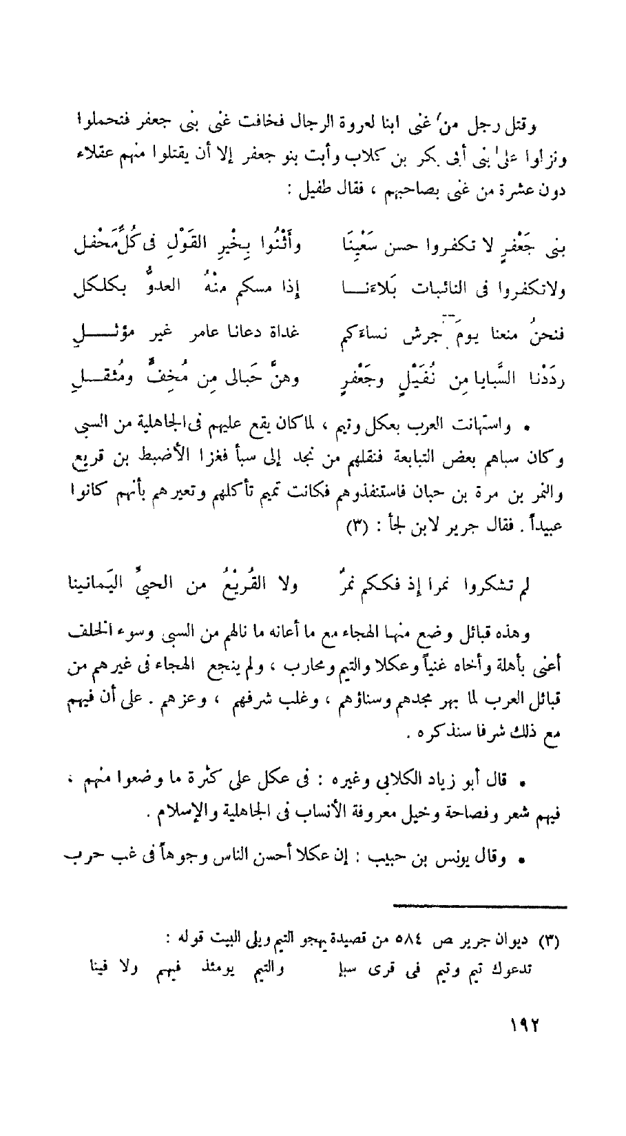 وهذه قبائل وضع منها الهجاء مع ما أعانه ما نالهم من السبي وسوء الخلف أعنى بأهلة وأخاه غنياً وعكلا والتيم ومحارب، ولم ينجح الهجاء في غيرهم من قبائل العرب لما بهر مجدهم وسناؤهم، وغلب شرفهم، وعزهم. على أن فيهم مع ذلك شرفا سنذكره.