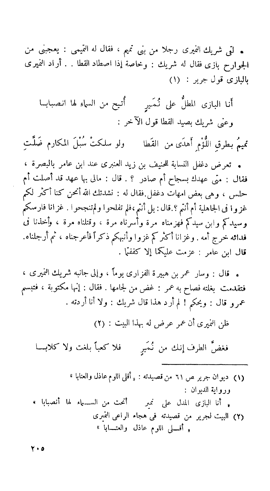 لقي شريك النمري رجلا من بني تميم، فقال له التميمي: يعجبني من الجوارح بازي فقال له شريك: وخاصة إذا اصطاد القطا. . أراد النميري بالبازي قول جرير: