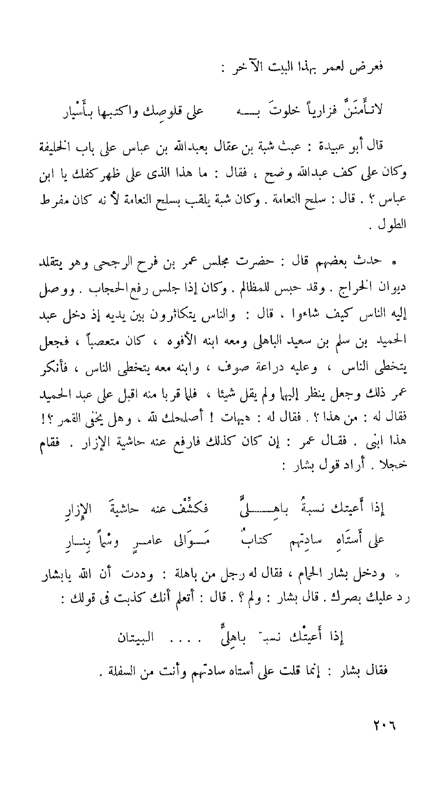 ودخل بشار الحمام، فقال له رجل من باهلة: وددت أن الله يا بشار رد عليك بصرك. قال بشار: ولم؟. قال: أتعلم أنك كذبت في قولك: إذا أعيتك نسبة باهلي. . . البيتان