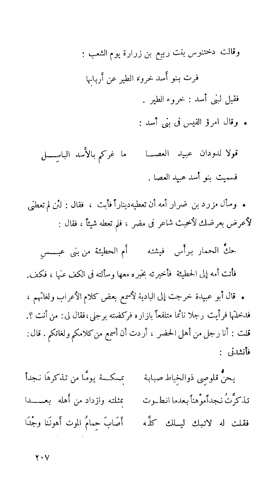 قال أبو عبيدة خرجت إلى البادية لأسمع بعض كلام الأعراب ولغاتهم، فدخلتها فرأيت رجلا من أهل الحضر، أردت أن أسمع من كلامكم ولغاتكم. قال فأنشدني: