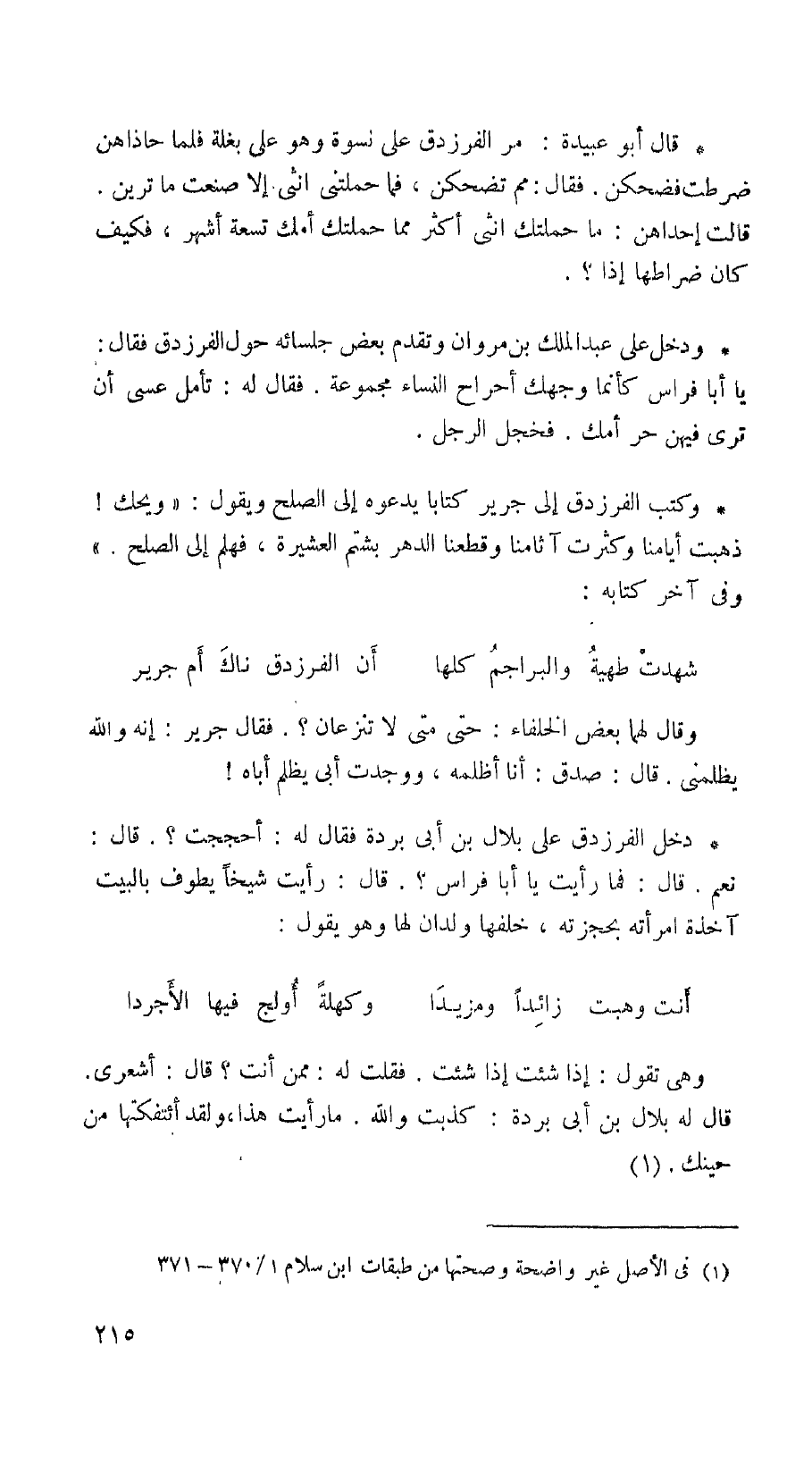 دخل الفرزدق على بلال بن أبي بردة فقال له: أحججت؟. قال: نعم. قال: فما رأيت يا أبا فراس؟. قال: رأيت شيخاً يطوف بالبيت آخذة امرأته بحجزته، خلفها ولدان لها وهو يقول: