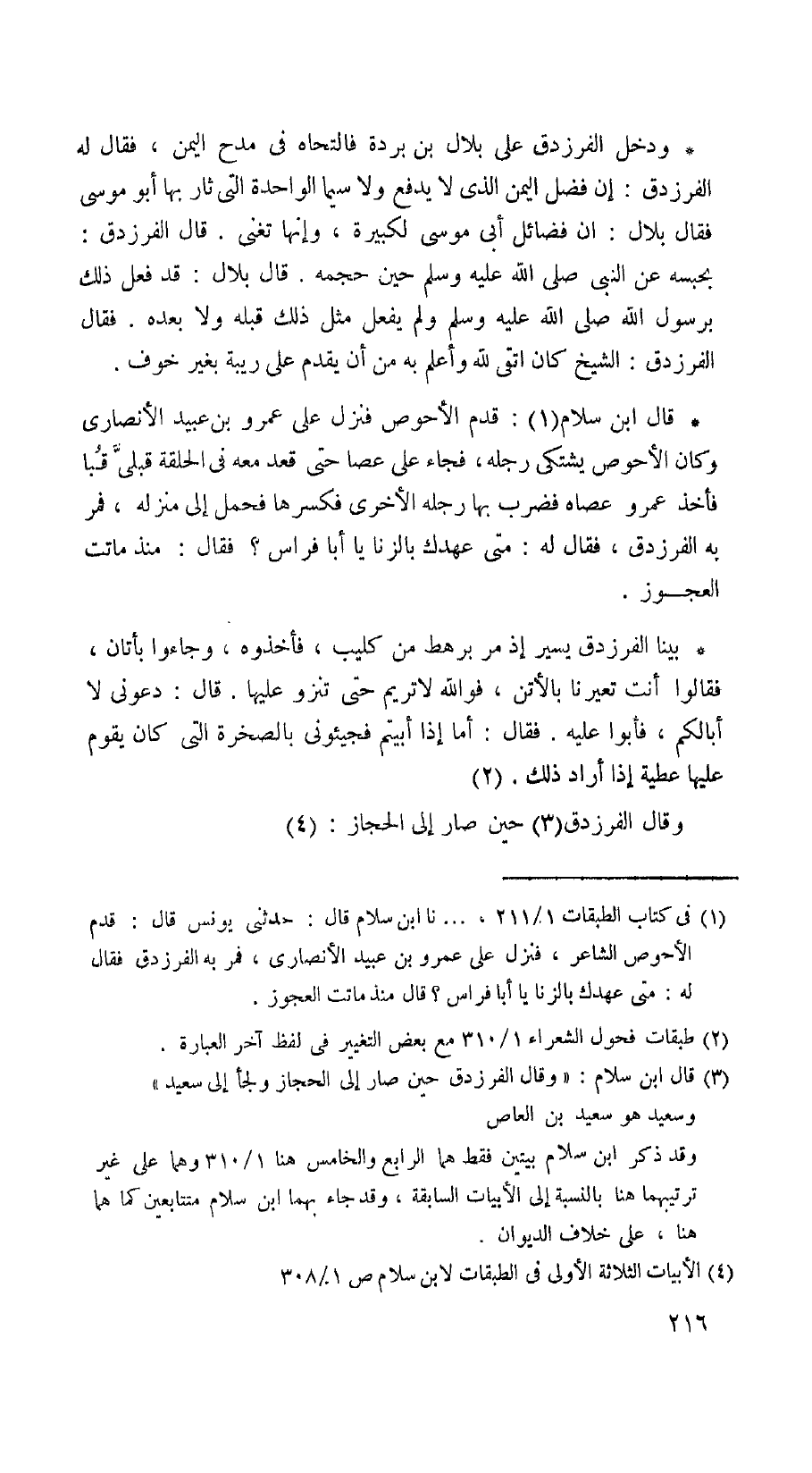 قال ابن سلام: قدم الأحوص فنزل على عمرو بن عبيد الأنصاري وكان الأحوص يشتكي رجله، فجاء على عصا حتى قعد معه في الحلقة قبلي قبا فأخذ عمرو عصاه فضرب بها رجله الأخرى فكسرها فحمل إلى منزله، فمر به الفرزدق، فقال له: متى عهدك بالزنا يا أبا فراس؟ فقال: منذ ماتت العجوز
