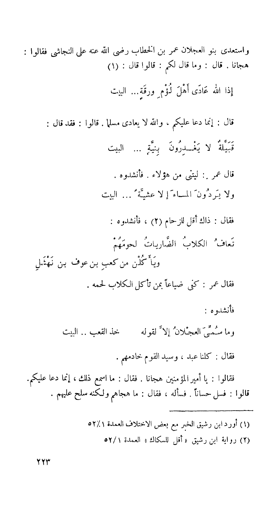 واستعدى بنو العجلان عمر بن الخطاب رضي الله عنه على النجاشي فقالوا: هجانا. قال: وما قال لكم: قالوا قال: