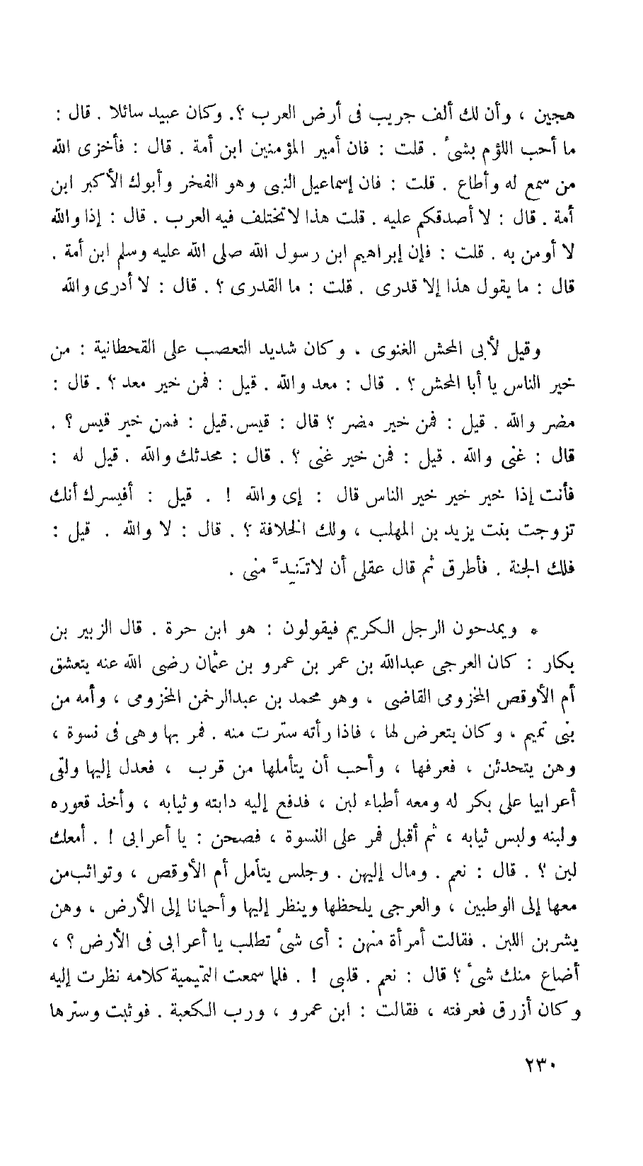 هجين، وأن لك ألف جريت في أرض العرب؟. وكان عبيد سائلاً. قال: ما أحب اللؤم بشيء. قلت: فان أمير المؤمنين ابن أمة. قال: فأخزى الله من سمع له وأطاع. قلت: فان إسماعيل النبي وهو الفخر وأبوك الأكبر ابن أمة. قال: لا أصدقكم عليه. قلت هذا لا تختلف فيه العرب. قال: إذا والله لا أومن به. قلت: فإن إبراهيم ابن رسول الله (صلى الله عليه وسلم) ابن أمة. قال: ما يقول هذا إلا قدري. قلت: ما القدري؟. قال: لا أدري والله.