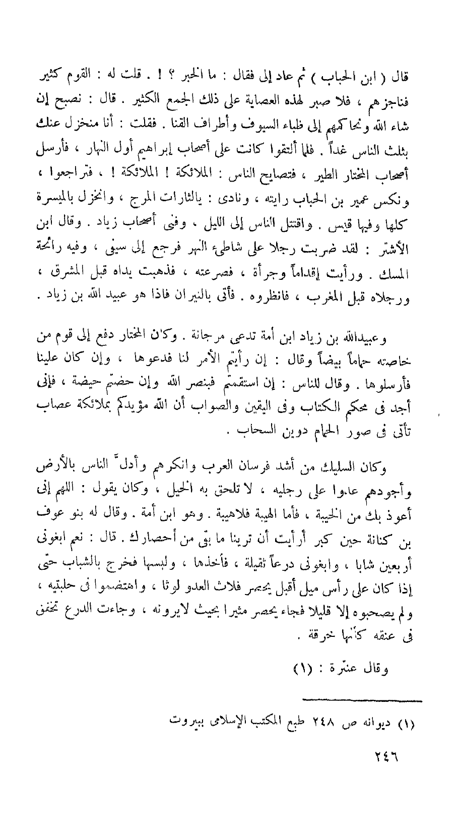 قال (ابن الحباب) ثم عاد إلي فقال: ما الخبر؟! قلت له: القوم كثير فناجزهم، فلا صبر لهذه العصابة على ذلك الجمع الكثير. قال: نصبح إن شاء الله ونحاكمهم إلى ظباء السيوف وأطرف القنا. فقلت: أنا منخذل عنك بثلث الناس غداً. فلما التقوا كانت على أصحاب إبراهيم أول النهار، فأرسل أصحاب المختار الطير، فتصايح الناس: الملائكة! الملائكة!، فتراجعوا، ونكس عمير بن