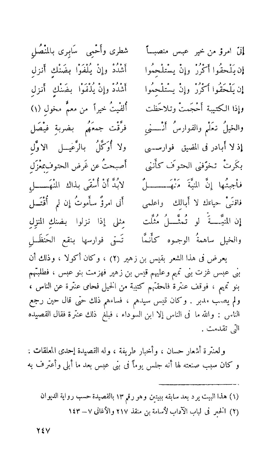 ولعنترة أشعار حسان، وأخبار طريفة، وله القصيدة إحدى المعلقات: وكان سبب صنعته لها أنه جلس يوماً في لبني عبس بعد ما أبلى وأعترف به
