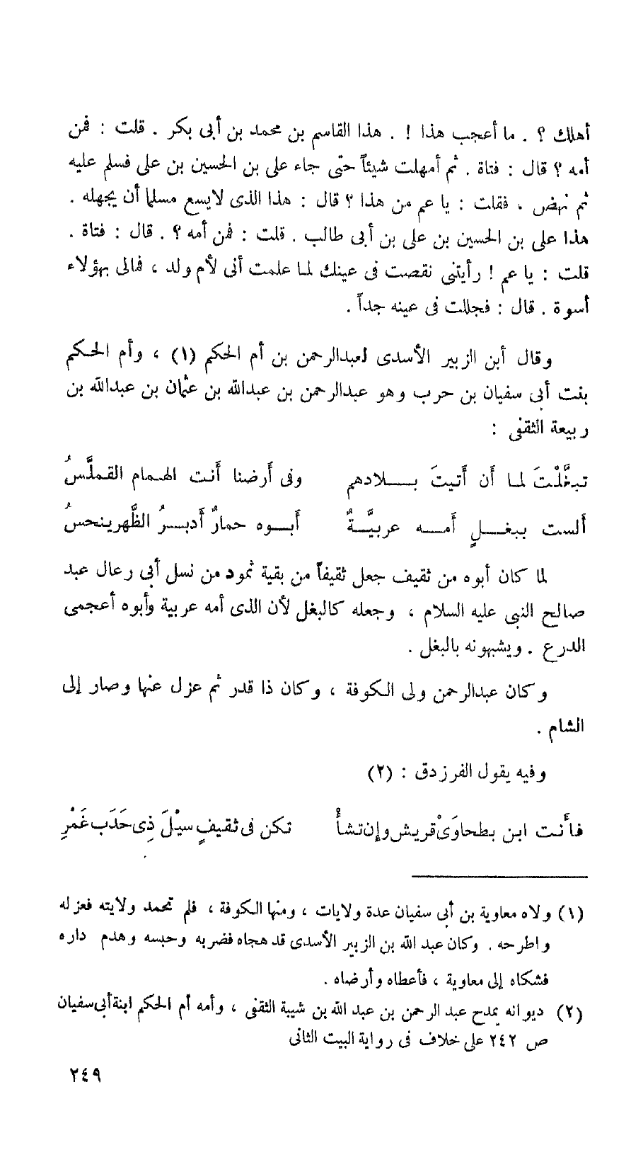 أهلك؟. ما أعجب هذا!. هذا القاسم بن محمد بن أبي بكر. قلت: فمن أمه؟ قال: فتاة. ثم أهملت شيئاً حتى جاء علي بن الحسين بن علي فسلم عليه ثم نهض، فقلت: يا عم من هذا؟ قال: هذا الذي لا يسع مسلما أن يجهله. هذا علي بن الحسين بن علي بن أبي طالب. قلت: فمن أمه؟. قال: فتاة