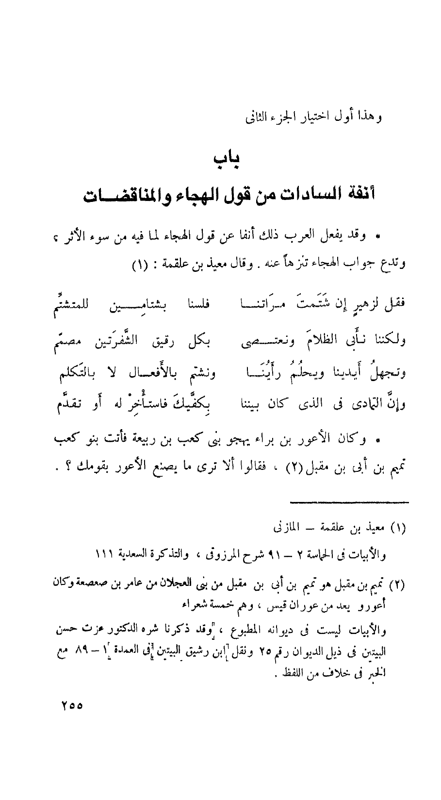 وقد يفعل العرب ذلك أنفا عن قول الهجاء لما فيه من سوء الأثر، وتدع جواب الهجاء تنزهاً عنه. وقال معيذ بن علقمة: