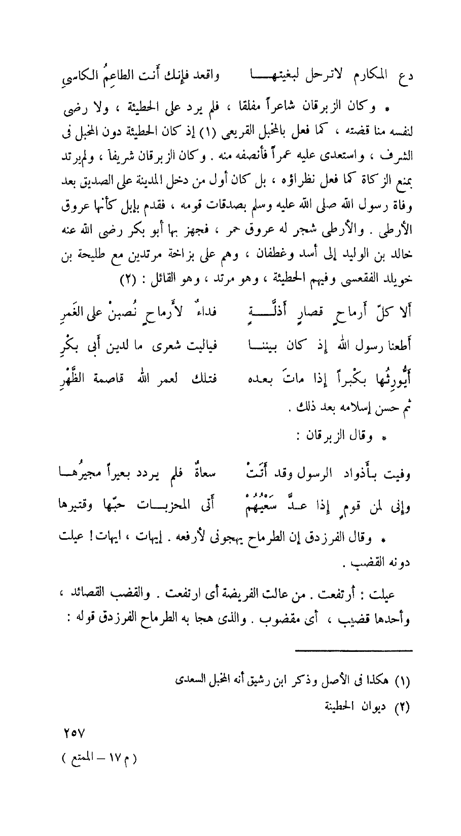 وكان الزبرقان شاعراً مفلقا، فلم يرد على الحطيئة، ولا رضي لنفسه مناقضته، كما فعل بالمخبل القريعي إذ كان الحطيئة دون المخبل في الشرف، واستعدى عليه عمراً فأنصفه منه. وكان الزبرقان شريفاً، ولم يرتد بمنع الزكاة كما فعل نظراؤه، بل كان أول من دخل المدينة على الصديق بعد وفاة رسول الله (صلى الله عليه وسلم) بصدقات قومه، فقدم بإبل كأنها عروق الأرطى. والأرطى شجر له عروق حمر، فجهز بها أبو بكر رضي الله عنه خالد بن الوليد إلى أسد وغطفان، وهم على بزاخة مرتدين مع طليحة بن خويلد الفقعسي وفيهم الحطيئة، وهو مرتد، وهو القائل: