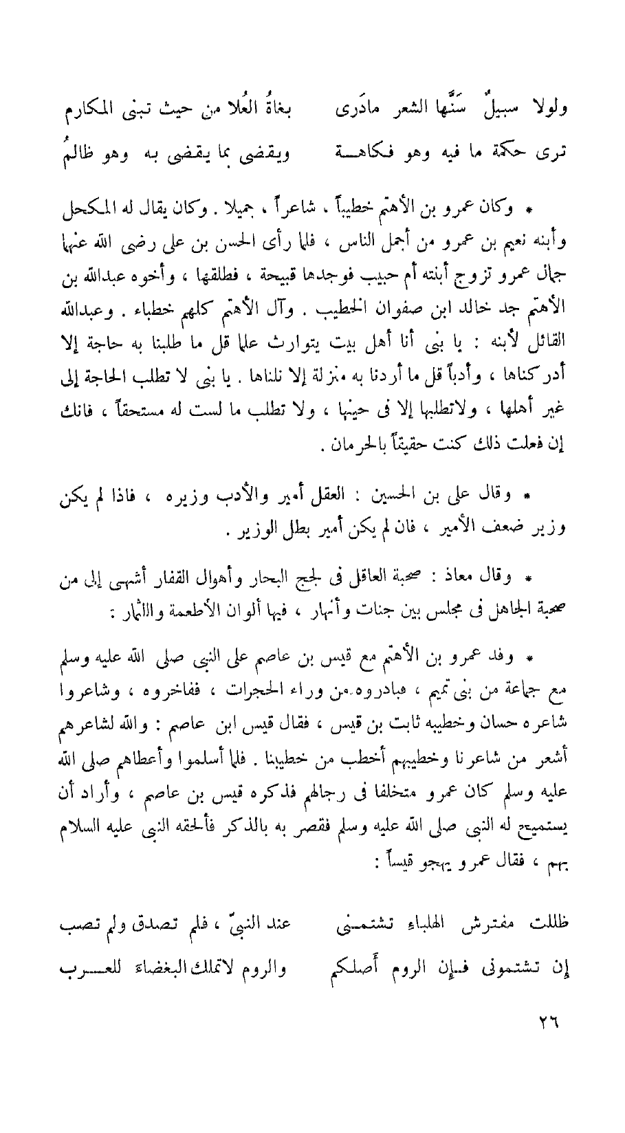 وكان عمرو بن الأهتم خطيبا، شاعرا، جميلا، وكان يقال له المكحل وابنه نعيم بن عمرو من أجمل الناس، فلما رأى الحسن بن علي رضي الله عنهما جمال عمرو تزوج ابنته أم حبيب فوجدها قبيحة، فطلقها، وأخوه عبد الله بن الأهتم جد خالد ابن صفوان الخطيب، وآل الأهتم كلهم خطباء، وعبد الله القائل لابنه: يا بني إنا أهل بيت يتوارث علما قل ما طلبنا به حاجة إلا أدركناها وأدبا قل ما أردنا به منزلة إلا نلناها. يا بني لا تطلب الحاجة إلا من أهلها، ولا تطلبها إلا في حينها، ولا تطلب ما لست له مستحقا، فأنك إن فعلت ذلك كنت حقيقا بالحرمان.