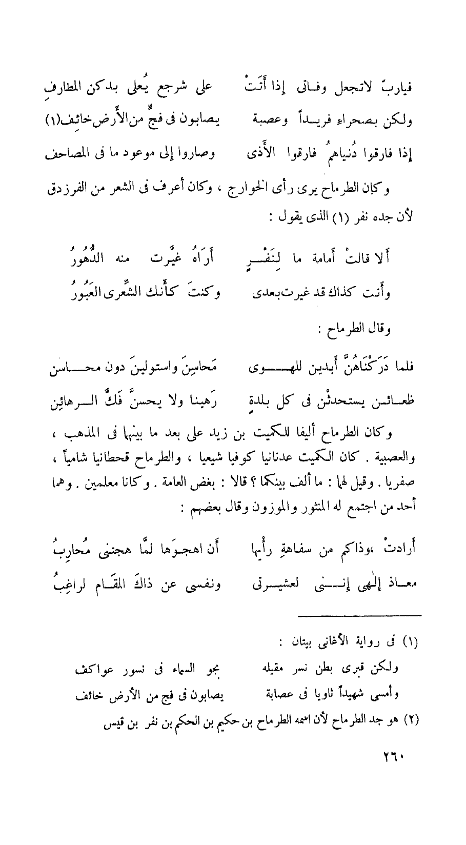 وكان الطرماح يرى رأي الخوارج، وكان أعرف في الشعر من الفرزدق لأن جده نفر الذي يقول: