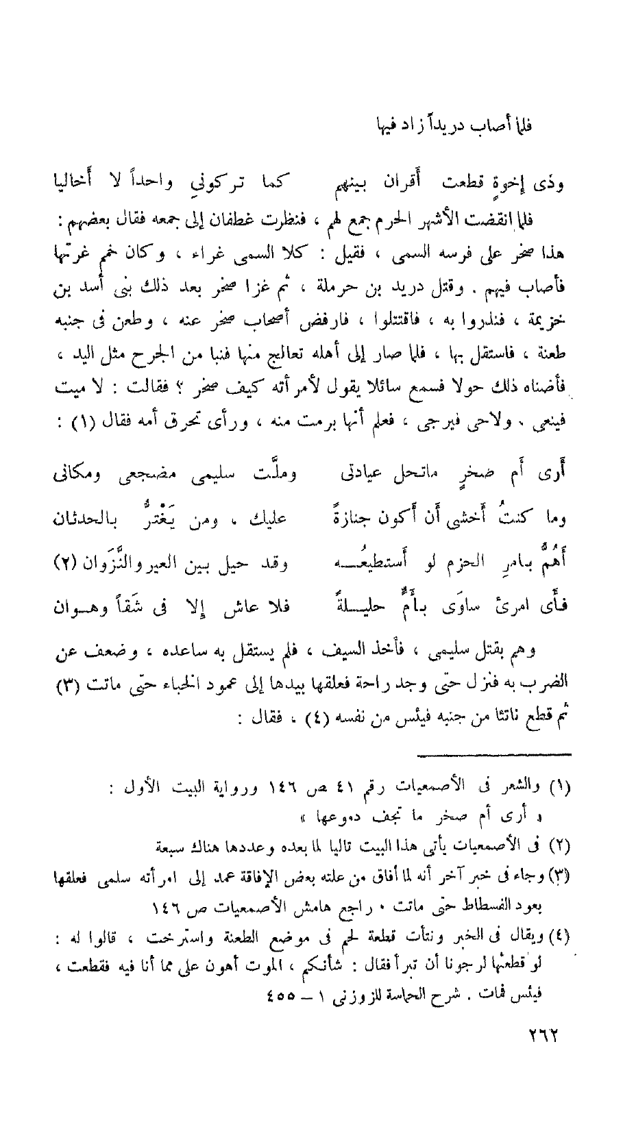 فلما انقضت الأشهر الحرم جمع لهم، فنظرت غطفان إلى جمعه فقال بعضهم: هذا صخر على فرسه السمى، فقيل: كلا السمى غراء، وكان خمم غرتها فأصاب فيهم. وقتل دريد بن حرملة، ثم غزا صخر بعد ذلك بني أسد بن خزيمة، فنذروا به، فاقتتلوا، فارفض أصحاب صخر عنه، وطعن في جنبه طعنة، فاستقل بها، فلما صار إلى أهله تعالج منها فنبا من الجرح مثل اليد، فأضناه ذلك حولا فسمع سائلا يقول لامرأته كيف صخر؟ فقالت: لا ميت فينعى، ولا حي فيرجى، فعلم أنها برمت منه، ورأى تحرق أمه فقال: