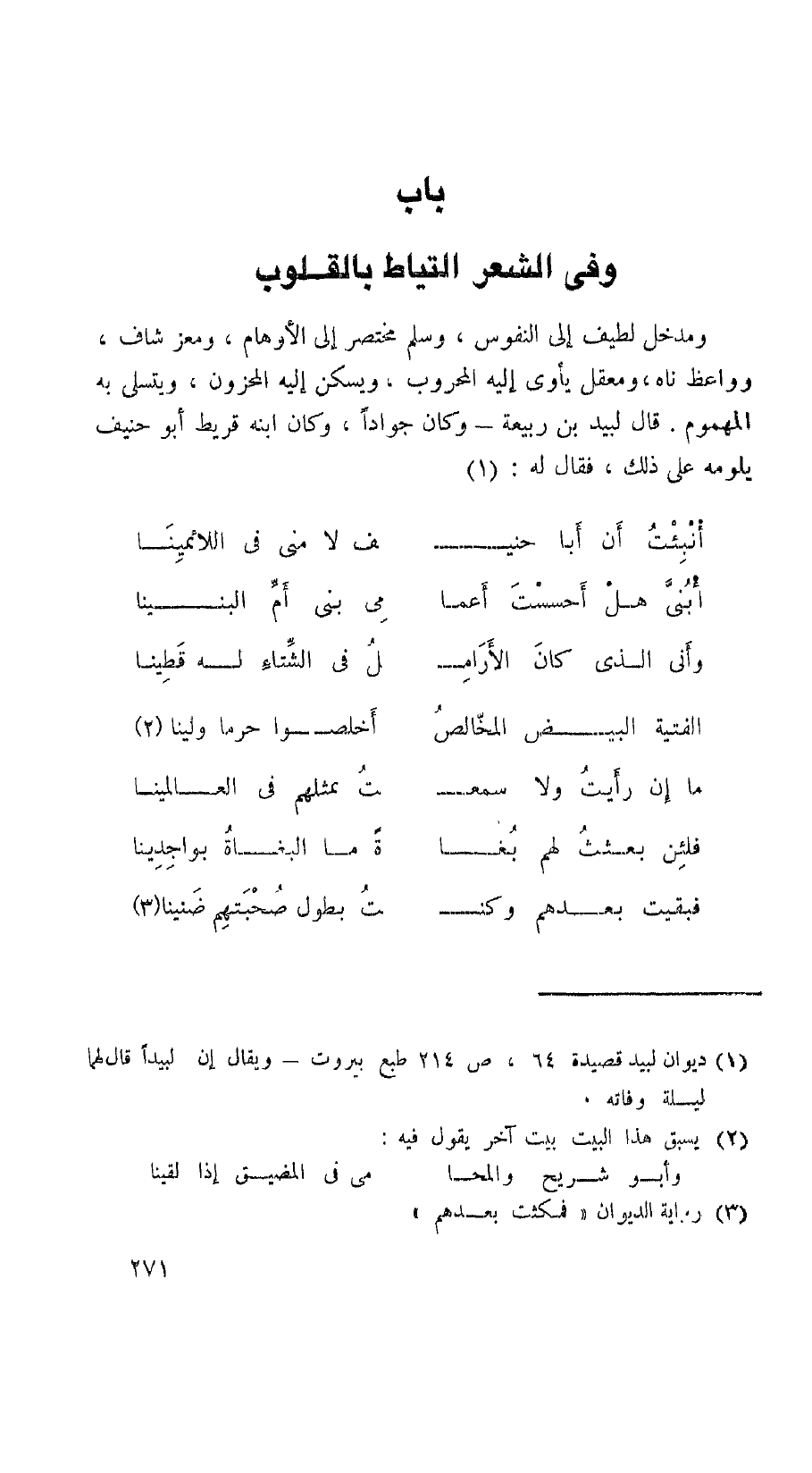 ومدخل لطيف إلى النفوس، وسلم محتضر إلى الأوهام، ومعز شاف، وواعظ ناه، ومعقل يأوى إليه المحروب، ويسكن إليه المحزون، ويتسلى به المهموم. قال لبيد بن ربيعة وكان جواداً، وكان ابنه قريط أبو حنيف يلومه على ذلك، فقال له: