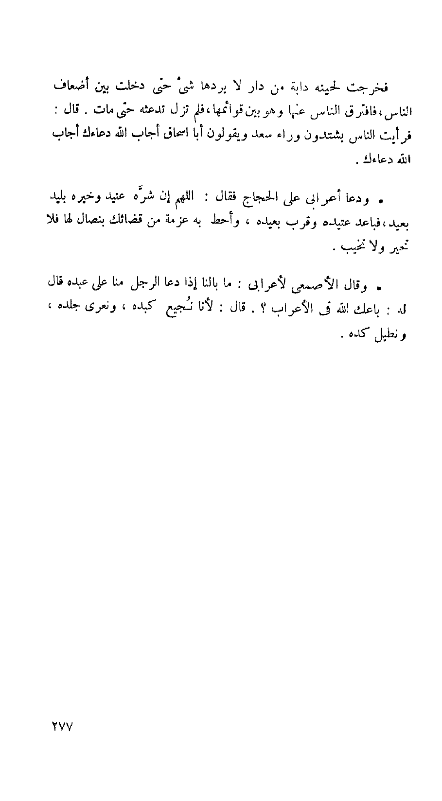وقال الأصمعي لأعرابي: ما بالنا إذا دعا الرجل منا على عبده قال له: باعك الله في الأعراب؟. قال: لأنا نجيع كبده، ونعرى جلده،، ونطيل كده.
