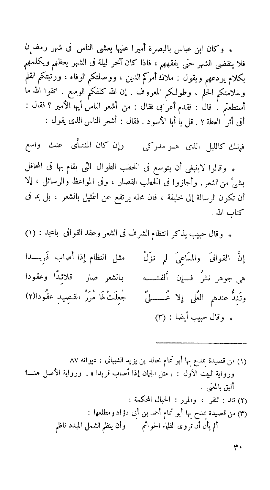 وكان ابن عباس بالبصرة أميرا عليها يعشى الناس في شهر رمضان فلا ينقضي الشهر حتى يفقههم، فإذا كان آخر ليلة في الشهر يعظهم ويكلمهم بكلام يودعهم ويقول: ملاك أمركم الدين، ووصلتكم الوفاء ورتبتكم القلم، وسلامتكم الحلم، وطولكم المعروف. إن الله كلفكم الوسع. اتقوا الله ما استطعتم قال: فقدم أعرابي فقال: من أشعر الناس أيها الأمير؟ فقال: في