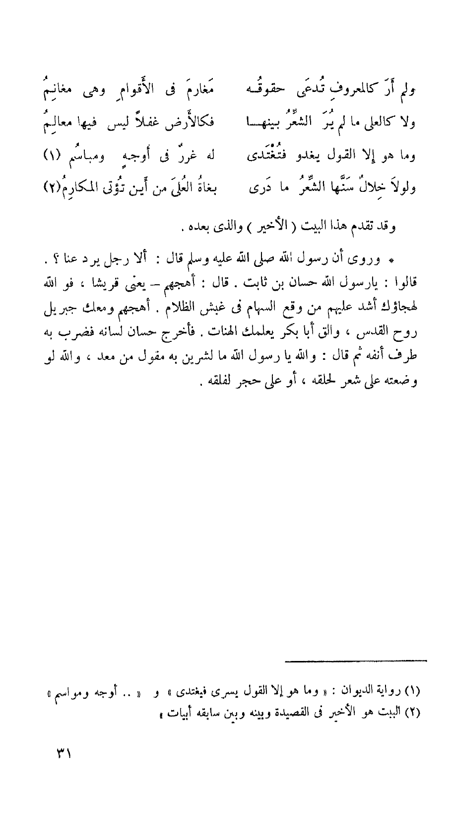 روى أن رسول الله (صلى الله عليه وسلم) قال: ألا رجل يرد عنا؟ قالوا: يا رسول حسان بن ثابت. قال: أهجهم - يعني قريشا -، فو الله لهجاؤك أشد عليهم من وقع السهام في غبش الظلام. أهجهم ومعك جبريل روح القدس، وألق أبا بكر يعلمك الهنات. فأخرج حسان لسانه فضرب به طرف أنفه ثم قال: والله يا رسول ما لشرين به مقول من معد، والله لو وضعته على شعر لحلقه أو على حجر لفلقه.