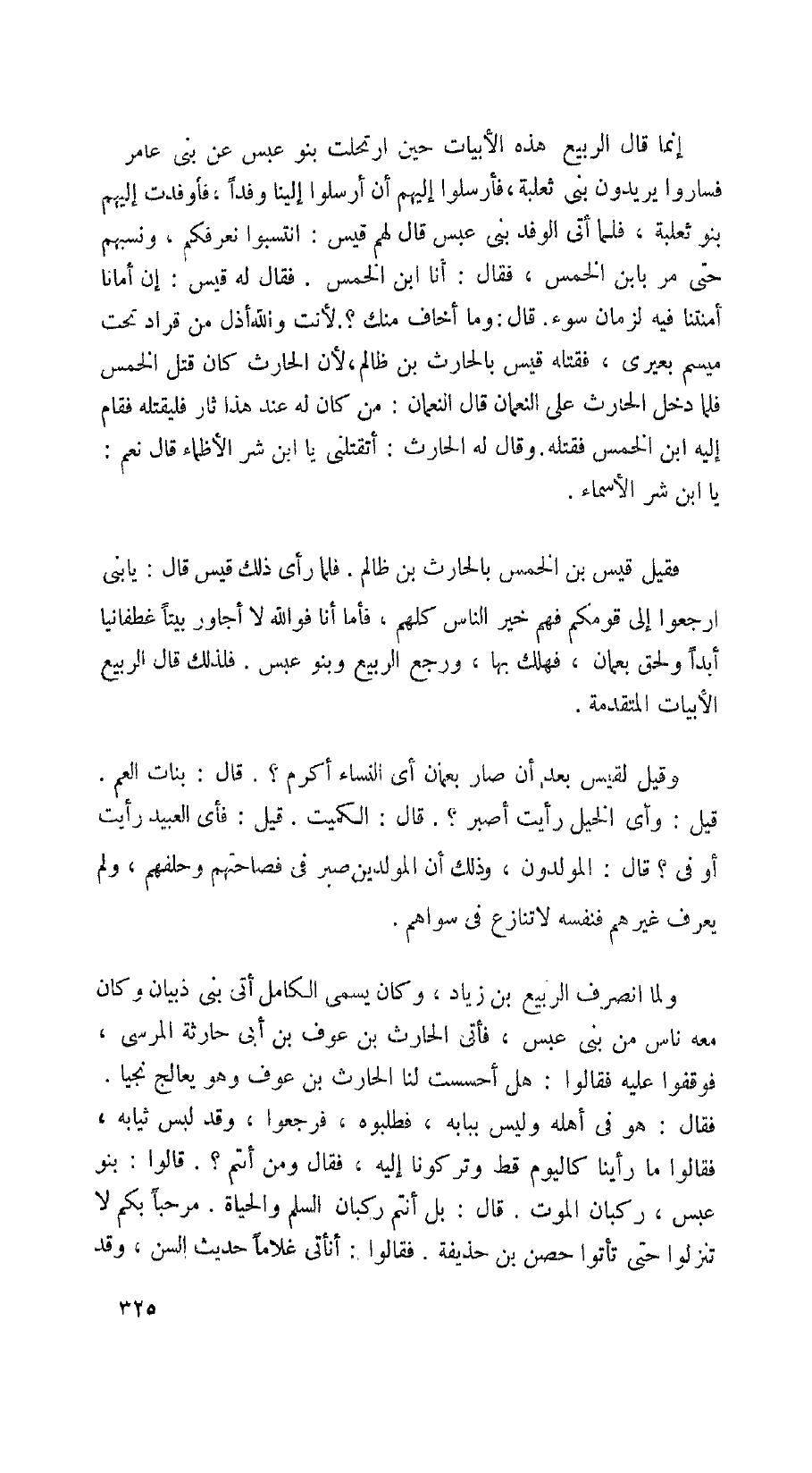 فقيل قيس بن الخمس بالحارث بن ظالم. فلما رأى ذلك قيس قال: يا بني ارجعوا إلى قومكم فهم خير الناس كلهم، فأما أنا فوالله لا أجاور بيتاً غطفانيا أبداً ولحق بعمان، فهلك بها، ورجع الربيع وبنو عبس. فلذلك قال الربيع الأبيات المتقدمة.