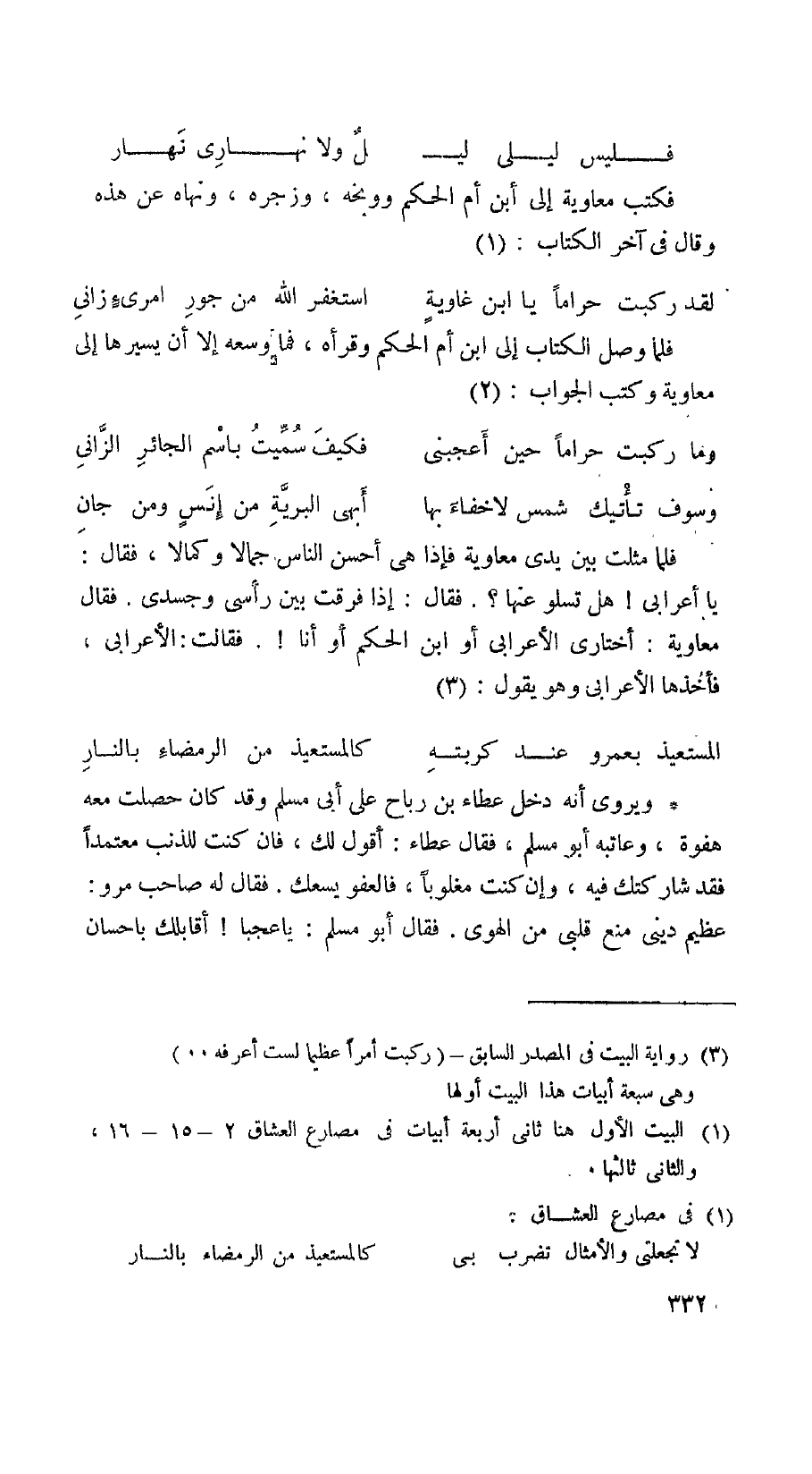 فلما مثلت بين يدي معاوية فإذا هي أحسن الناس جمالا وكمالا، فقال: يا أعرابي! هل تسلو عنها؟. فقال: إذا فرقت بين رأسي وجسدي. فقال معاوية: أختاري الأعرابي أو ابن الحكم أو أنا!. فقالت: الأعرابي، فأخذها الأعرابي وهو يقول: