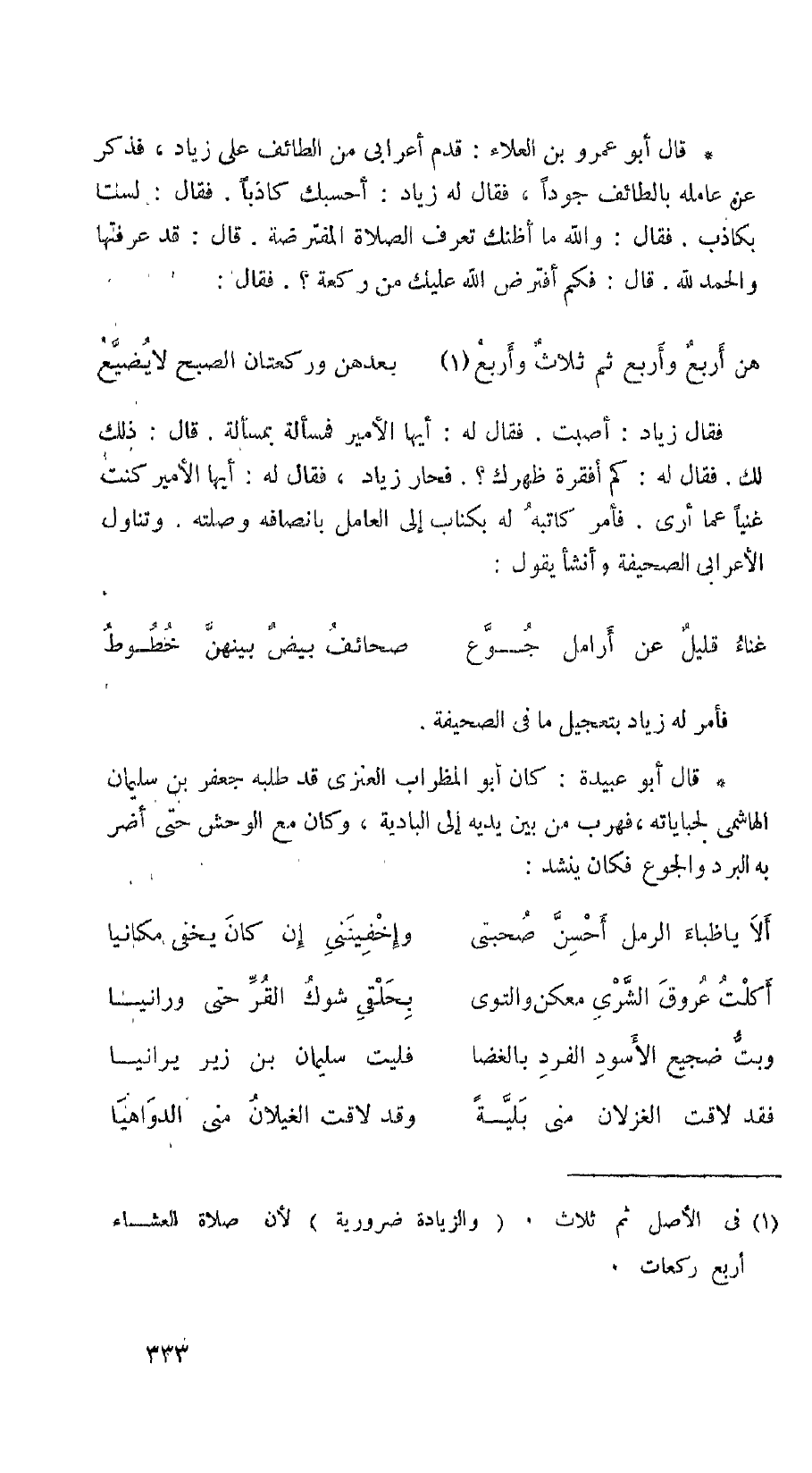 قال أبو عمرو بن العلاء: قدم أعرابي من الطائف على زياد، فذكر عن عامله بالطائف جوداً، فقال له زياد: أحسبك كاذباً. فقال: لست بكاذب. فقال: والله ما أظنك تعرف الصلاة المفترضة. قال: قد عرفتها والحمد لله. قال: فكم أفترض الله عليك من ركعة؟. فقال: