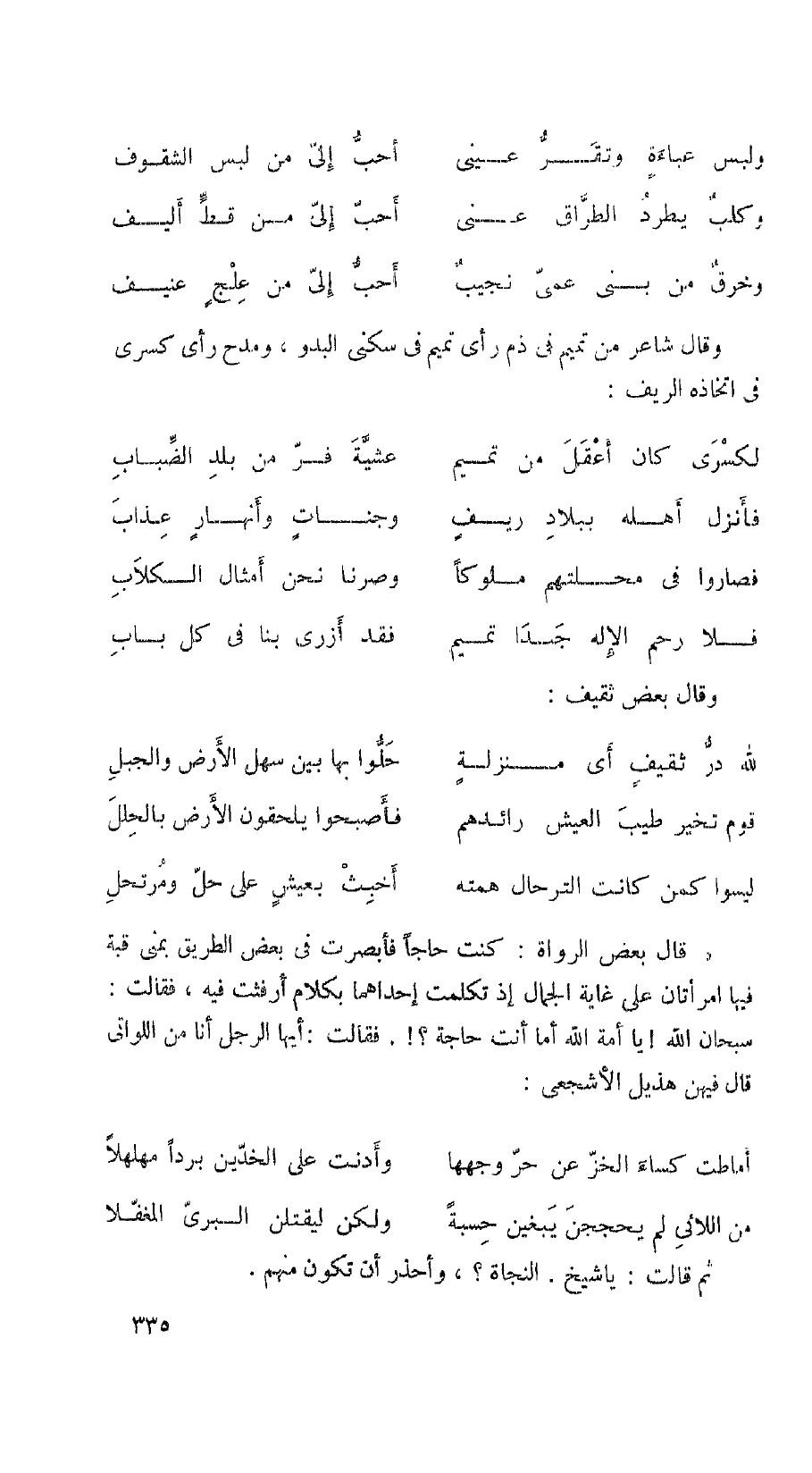 وقال شاعر من تميم في ذم رأى تميم في سكنى البدو، ومدح رأى كسرى في اتخاذه الريف: