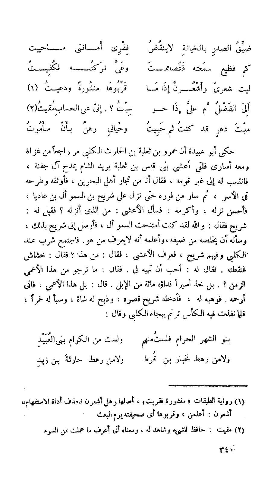 شريح فقال: والله لقد كنت امتدحت السموأل، فأرسل إلى شريح بذلك، وسأله أن يخلصه من ضيفه، وأعلمه أنه لا يعرف من هو. فاجتمع شرب عند الكلبي وفيهم شريح، فعرف الأعشى، فقال: من هذا؟ فقال: خشاش التقطته. فقال له: أحب أن تهبه لي. فقال: ما ترجو من هذا الأعمى الزمن؟. بل خذ أسيراً فداؤه مائة من الإبل. قال: بل هذا الأعمى، فاني أرحمه. فوهبه له، فأدخله شريح قصره، وذبح له شاة، وسبأ له خمراً، فلما نفذت فيه الكأس ترنم بهجاء الكلبي وقال: