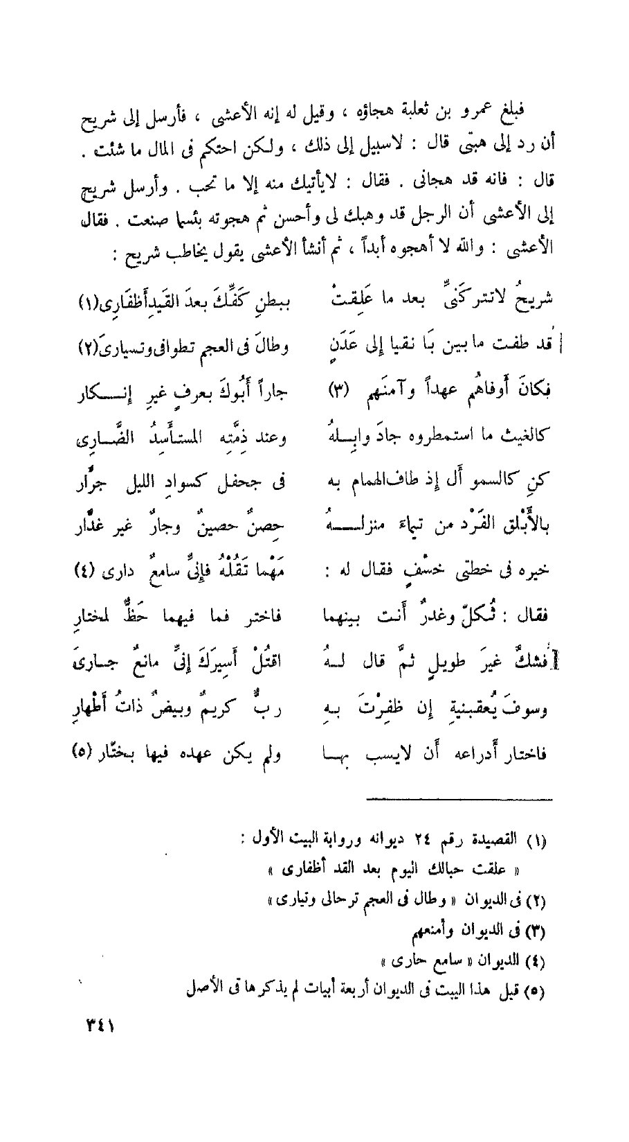 فبلغ عمرو بن ثعلبة هجاؤه، وقيل له إنه الأعشى، فأرسل إلى شريح أن رد إلي هبتي قال: لا سبيل إلى ذلك، ولكن احتكم في المال ما شئت. قال: فانه قد هجاني. فقال: لا يأتيك منه إلا ما تحب. وأرسل شريح إلى الأعشى أن الرجل قد وهبك لي وأحسن ثم هجوته بئسما صنعت. فقال الأعشى: والله لا أهجوه أبداً، ثم أنشأ الأعشى يقول يخاطب شريح: