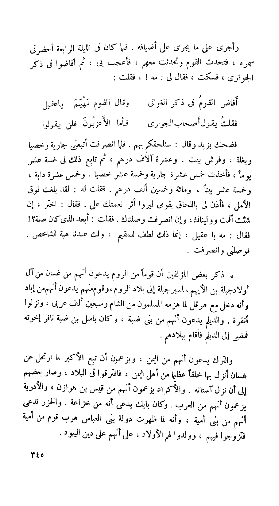 وأجرى علي ما يجري على أضيافه. فلما كان في الليلة الرابعة أحضرني سمره، فتحدث القوم وتحدثت معهم، فأعجب بي، ثم أفاضوا في ذكر الجواري، فسكت، فقال لي: مه!، فقلت: