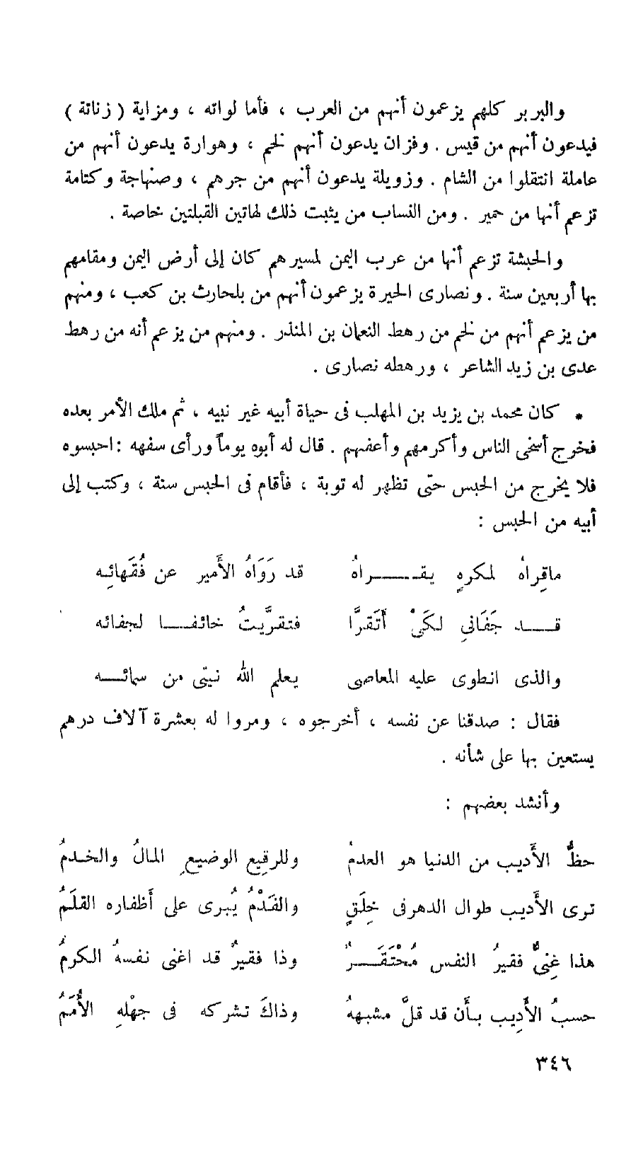والبربر كلهم يزعمون أنهم من العرب، فأما لواته، ومزاية (زناته) فيدعون أنهم من قيس. وفزان يدعون أنهم لخم، وهوارة يدعون أنهم من عاملة انتقلوا من الشام. وزويلة يدعون أنهم من جرهم، وصنهاجة وكتامة تزعم أنها من حمير. ومن النساب من يثبت ذلك لهاتين القبلتين خاصة.