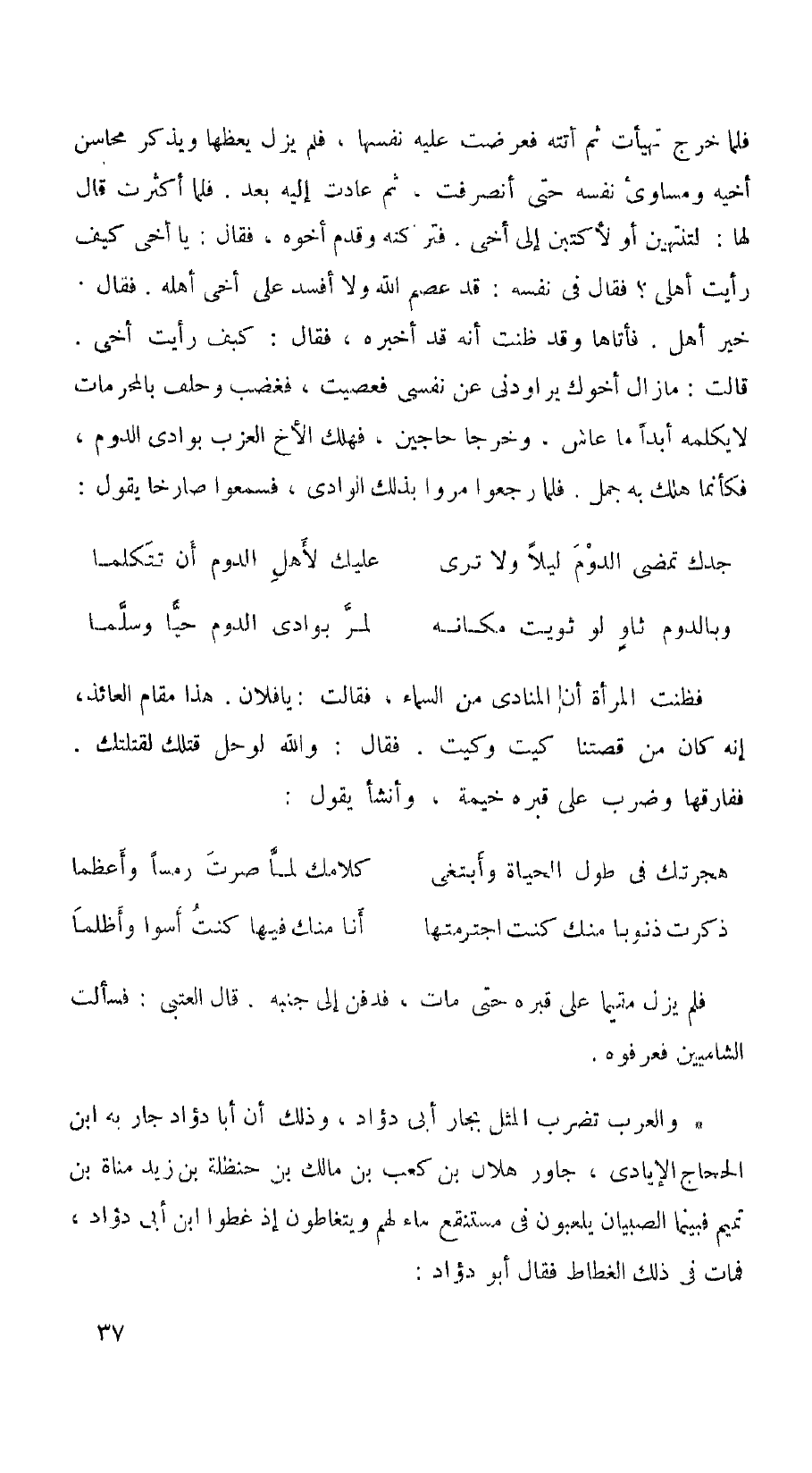 فلما خرج تهيأت ثم أتته فعرضت عليه نفسها، فلم يزل يعظها ويذكر محاسن أخيه ومساوئ نفسه حتى انصرفت، ثم عادت إليه بعد. فلما أكثرت قال لها: لتنتهين أو لأكتبن إلى أخي. فتركته وقدم أخوه، فقال: يا أخي كيف رأيت أهلي؟ فقال في نفسه: قد عصم الله ولا أفسد على أخي أهله. فقال: خير أهل. فأتاها وقد ظنت أنه قد أخبره، فقال: كيف رأيت أخي. قالت: ما زال أخوك يراودني عن نفسي فعصيت، فغضب وحلف بالمحرمات لا يكلمه أبداً ما عاش، وخرجا حاجين، فهلك الأخ الأعزب بوادي الدوم، فكأنما هلك به جمل. فلما رجعوا مروا بذلك الوادي فسمعوا صارخا يقول: