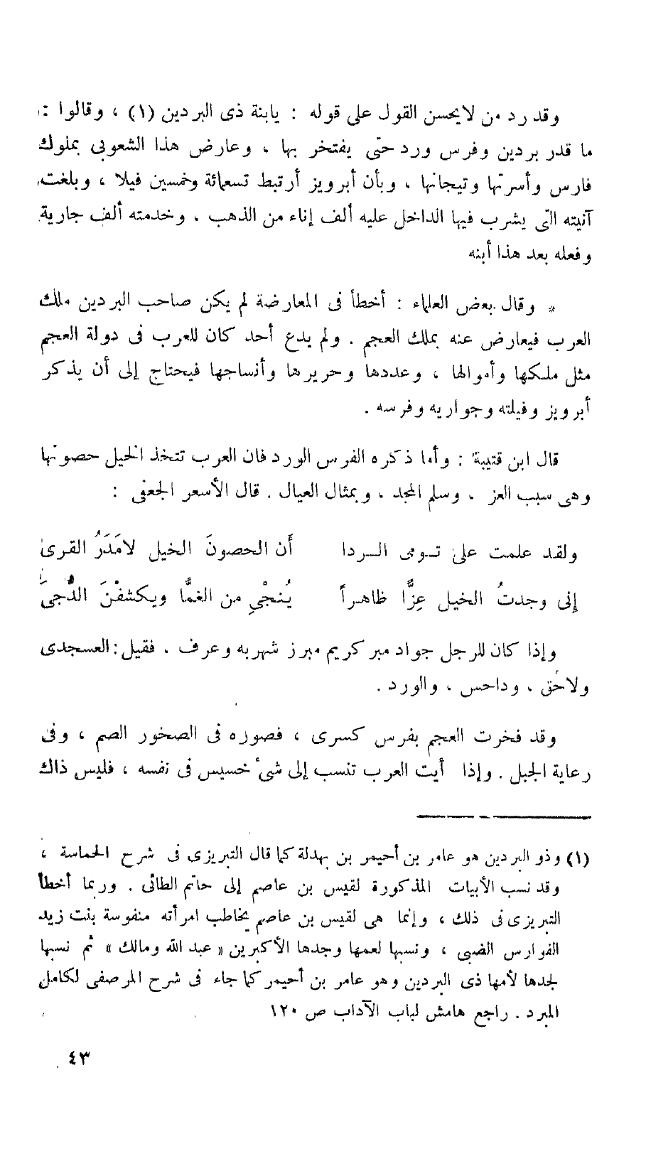 وإذا كان للرجال جواد مبر كريم مبرز شهر به وعرف، فقيل: العسجدي ولاحق، وداحس، والورد. وقد فخرت العجم بفرس كسرى، فصوره في الصخور الصم، وفي الجبل، وإذا رأيت العرب تنسب إلى شيء خسيس في نفسه فليس ذاك