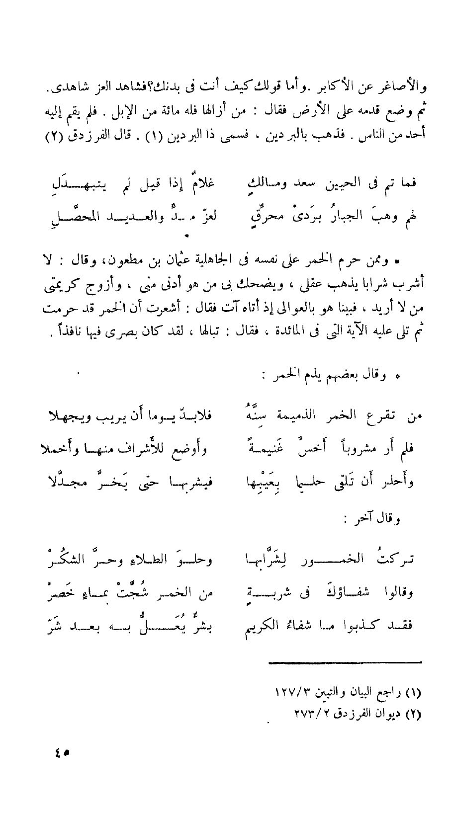 والأصاغر على الأكابر. وأما قولك كيف أنت في بدنك؟ فشاهد العز شاهدي. ثم وضع قدمه على الأرض فقال: من أزالها فله مائة من الإبل. فلم يقم إليه أحد من الناس فذهب بالبردين، فسمي ذا البردين. قال الفرزدق: