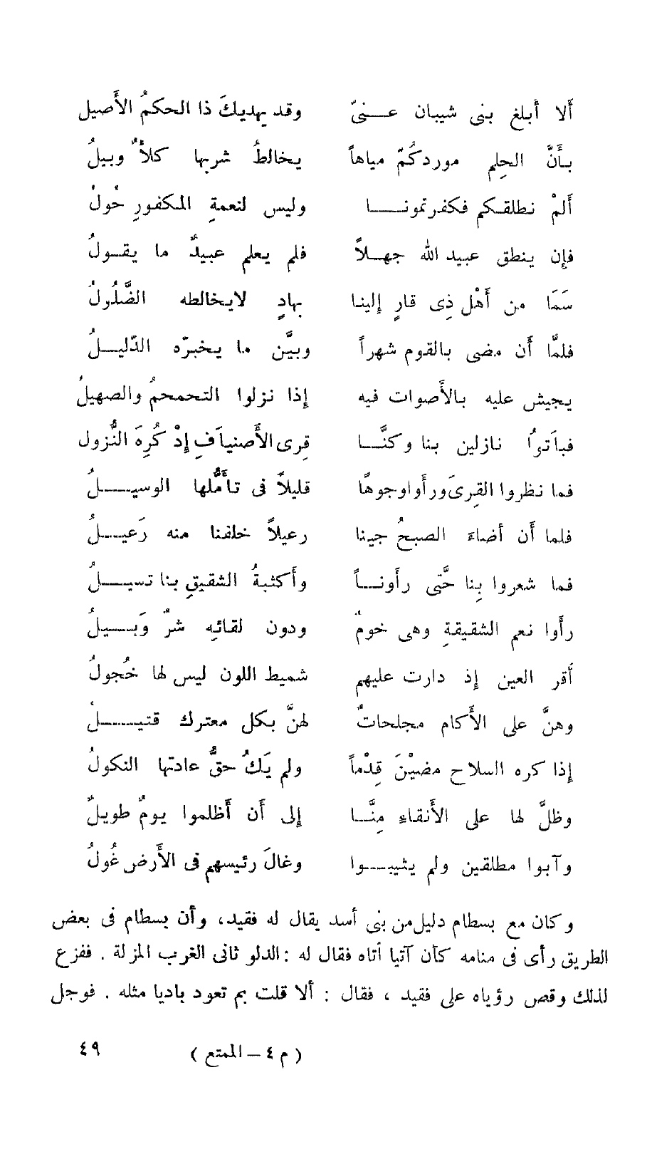 وكان مع بسطام دليل من بني أسد يقال له فقيد، وأن بسطام في بعض الطريق رأى في منامه كأن آتيا أتاه فقال له: الدلو ثاني الغرب المزلة. ففزع لذلك وقص رؤياه على فقيد، فقال: ألا قلت بم تعود باديا مثله. فوجل