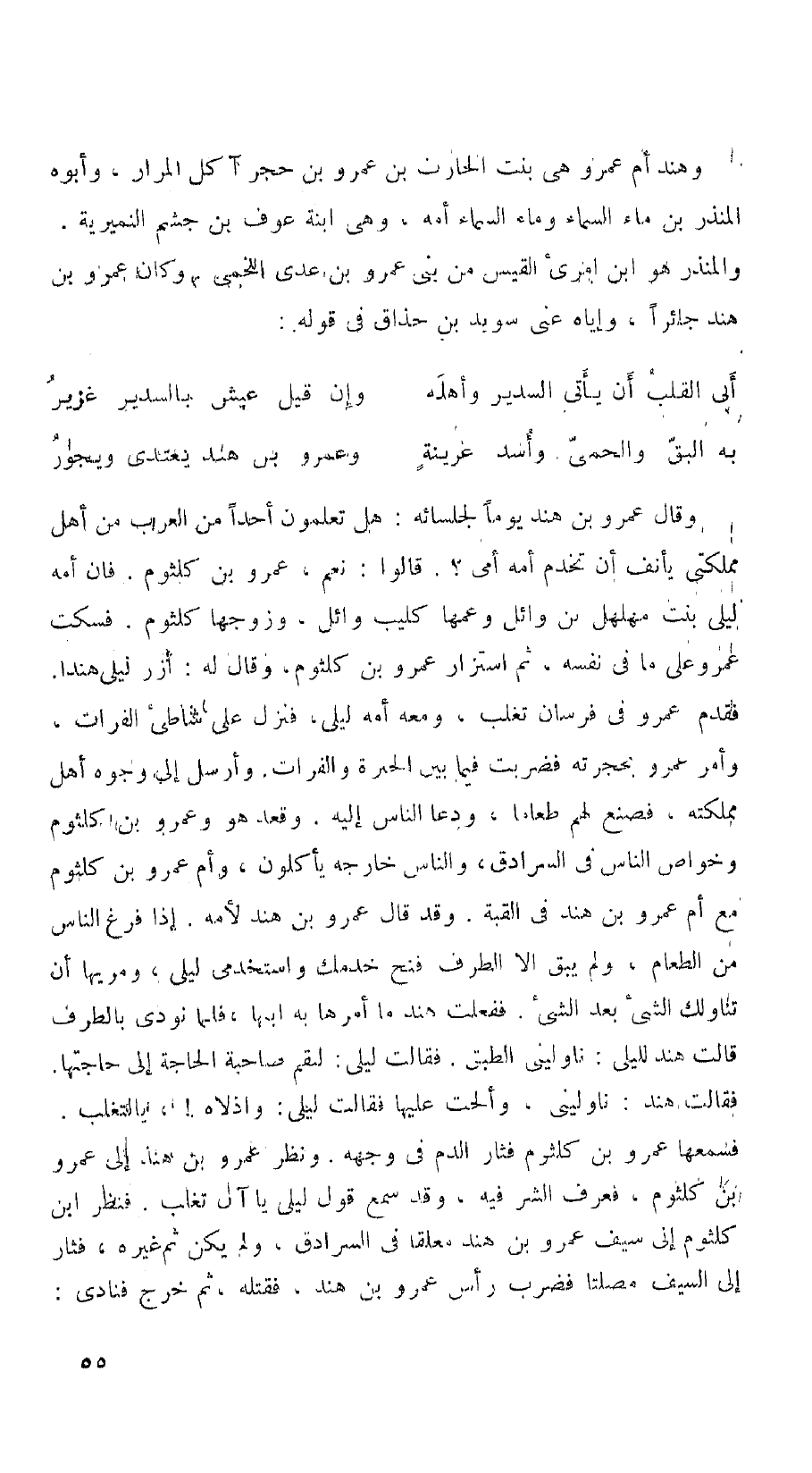 تخدم أمه أمي؟. قالوا: نعم، عمرو بن كلثوم. فإن أمه ليلى بنت مهلهل بن وائل وعمها كليب وائل، وزوجها كلثوم. فسكت عمرو على ما في فرسان تغلب، ومعه أمه ليلى، فنزل على شاطئ الفرات، وأمر عمرو بحجرته فضربت فيما بين الحيرة والفرات. وأرسل إلى وجوه أهل مملكته، فصنع لهم طعاما، ودعا الناس إليه. وقعد هو وعمرو بن كلثوم وخواص الناس في السرادق، والناس خارجه يأكلون، وأم عمرو بن كلثوم مع أم عمرو بن هند في القبة. وقد قال عمرو بن هند لأمه. إذا فرغ الناس من الطعام، ولم يبق الا الطرف فنحي خدمك واستخدمي ليلى، ومريها أن تناولك الشيء بعد الشيء. ففعلت هند ما أمرها به ابنها فلما نودي بالطرف قالت هند لليلى: ناوليني الطبق. فقالت ليلى لتقم صاحبة الحاجة إلى حاجتها. فقالت هند: ناوليني، وألحت عليها فقالت ليلى: واذلاه!، يا لتغلب. فسمعها عمرو بن كلثوم فثار الدم في وجهه. ونظر عمرو بن هند إلى عمرو بن كلثوم، فعرف الشر فيه، وقد سمع قول ليلى يا آل تغلب. فنظر ابن كلثوم إلى سيف عمرو بن هند معلقا في السرادق، ولم يكن ثم غيره، فثار إلى السيف مصلتاً فضرب رأس عمرو بن هند، فقتله، ثم خرج فنادى: