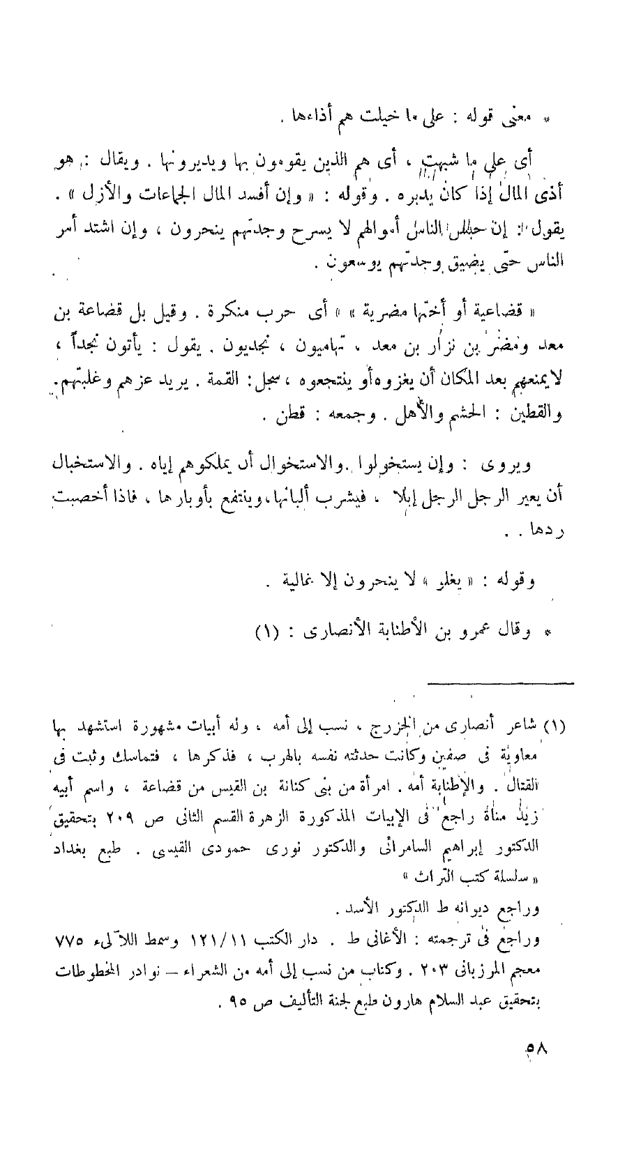 (قضاعية أو أختها مضرية) أي حرب منكرة. وقيل بل قضاعة بن معد ومضر بن نزار بن معد، تهاميون، نجديون. يقول: يأتون نجداً، لا يمنعهم بعد المكان أن يغزوه أو ينتجعوه،