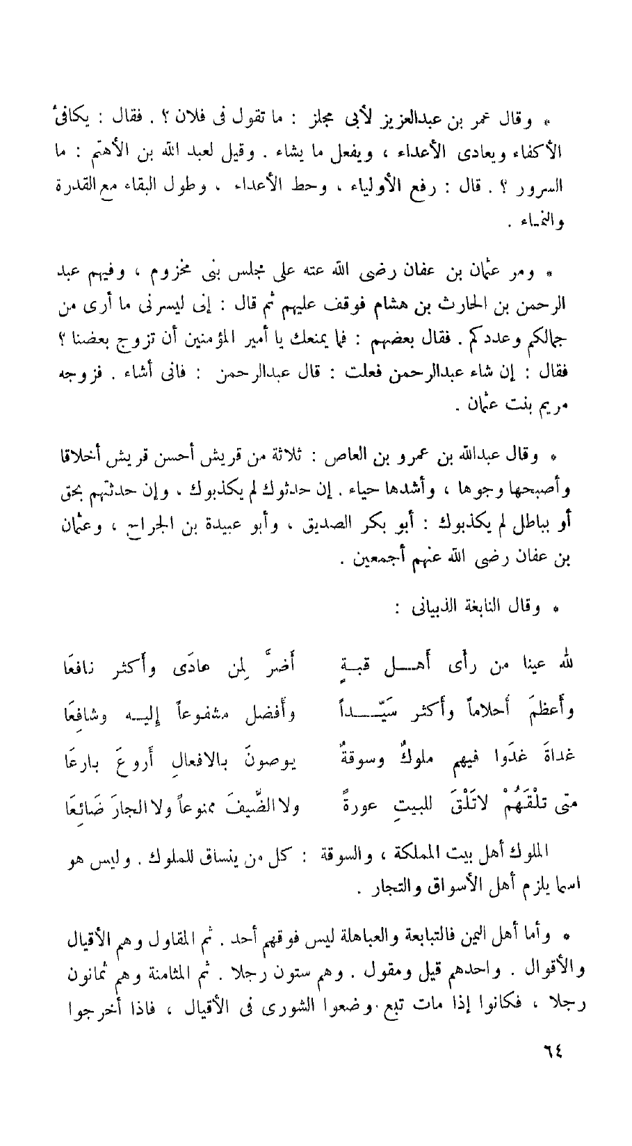 وقال عمر بن عبد العزيز لأبي مجلز: ما تقول في فلان؟. فقال: يكافئ الأكفاء ويعادي الأعداء، ويفعل ما يشاء. وقيل لعبد الله بن الأهتم: ما السرور؟. قال: رفع الأولياء، وحط الأعداء، وطول البقاء مع القدرة والنماء.