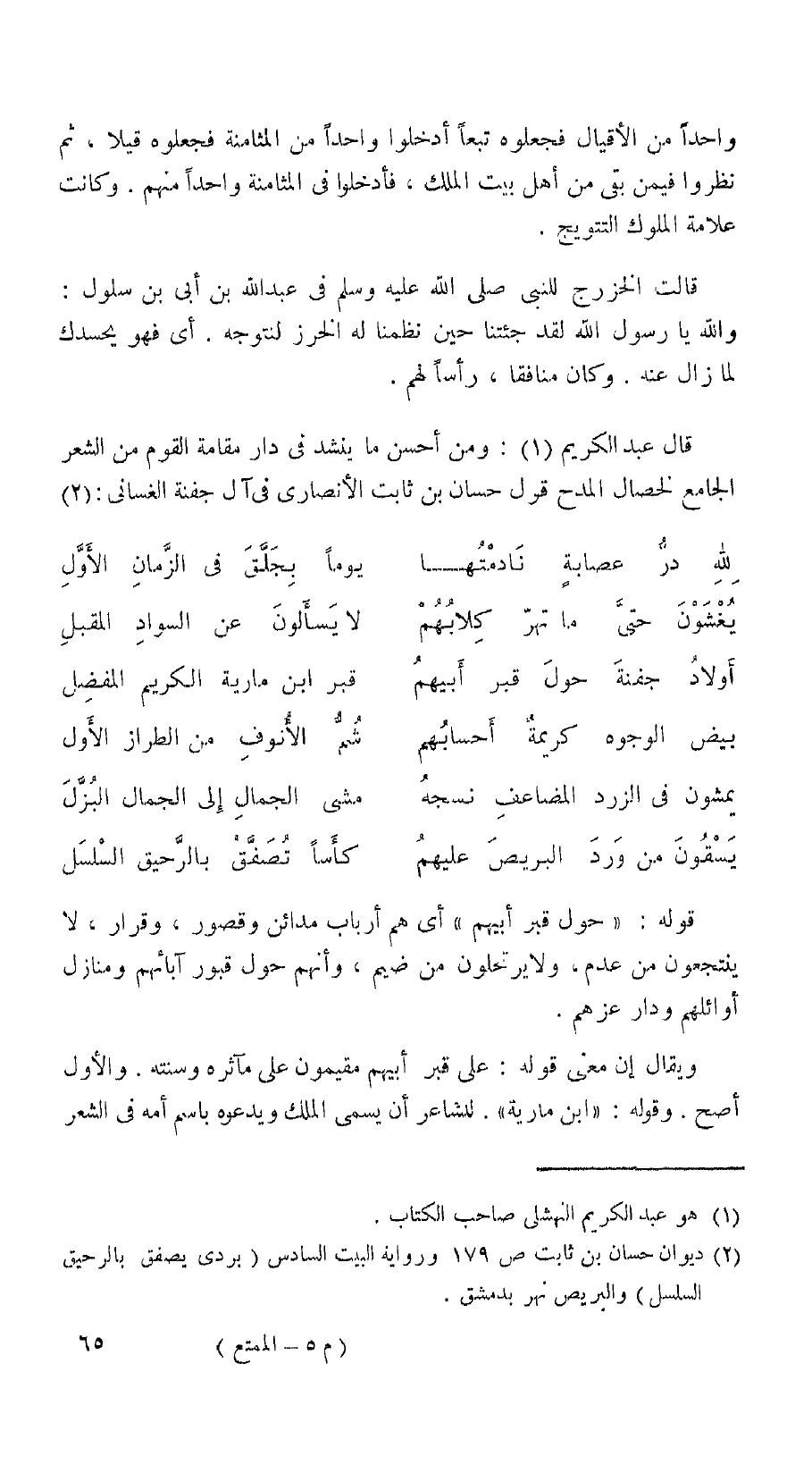 قال عبد الكريم: ومن أحسن ما ينشد في دار مقامة القوم من الشعر الجامع لخصال المدح قول حسان بن ثابت الأنصاري في آل جفنة الغساني: