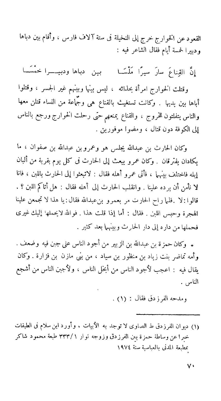 وقتلت الخوارج امرأة بحذائه، ليس بينها وبينهم غير الجسر، وقتلوا أباها بين يدها. وكانت تستغيث بالقناع هي وجماعة من النساء قتلن معها والناس يتفلتون للخروج، والقناع يمنعهم حتى رحلت الخوارج ورجع بالناس إلى الكوفة دون قتال، ومضوا موفورين. وكان الحارث بن عبد الله يجلس هو وعمرو بن عبد الله بن صفوان، ما يكادان يفترقان. وكان عمرو يبعث إلى الحارث في كل يوم بقربة من ألبان إبله فاختلف بينهما، فأتى عمرو أهله فقال: لا تبعثوا إلى الحارث باللبن، فأنا لا نأمن أن يرده علينا. وانقلب الحارث إلى أهله فقال: هل أتاكم اللبن؟. قالوا: لا فلما راح الحارث مر بعمرو بن عبد الله فقال: يا هذا لا تجمعن علينا الهجرة وحبس اللبن. فقال: أما إذا قلت هذا. فو الله لا يحملها إليك غير فحملها من داره إلى دار الحارث وبينهما بعد كثير.
