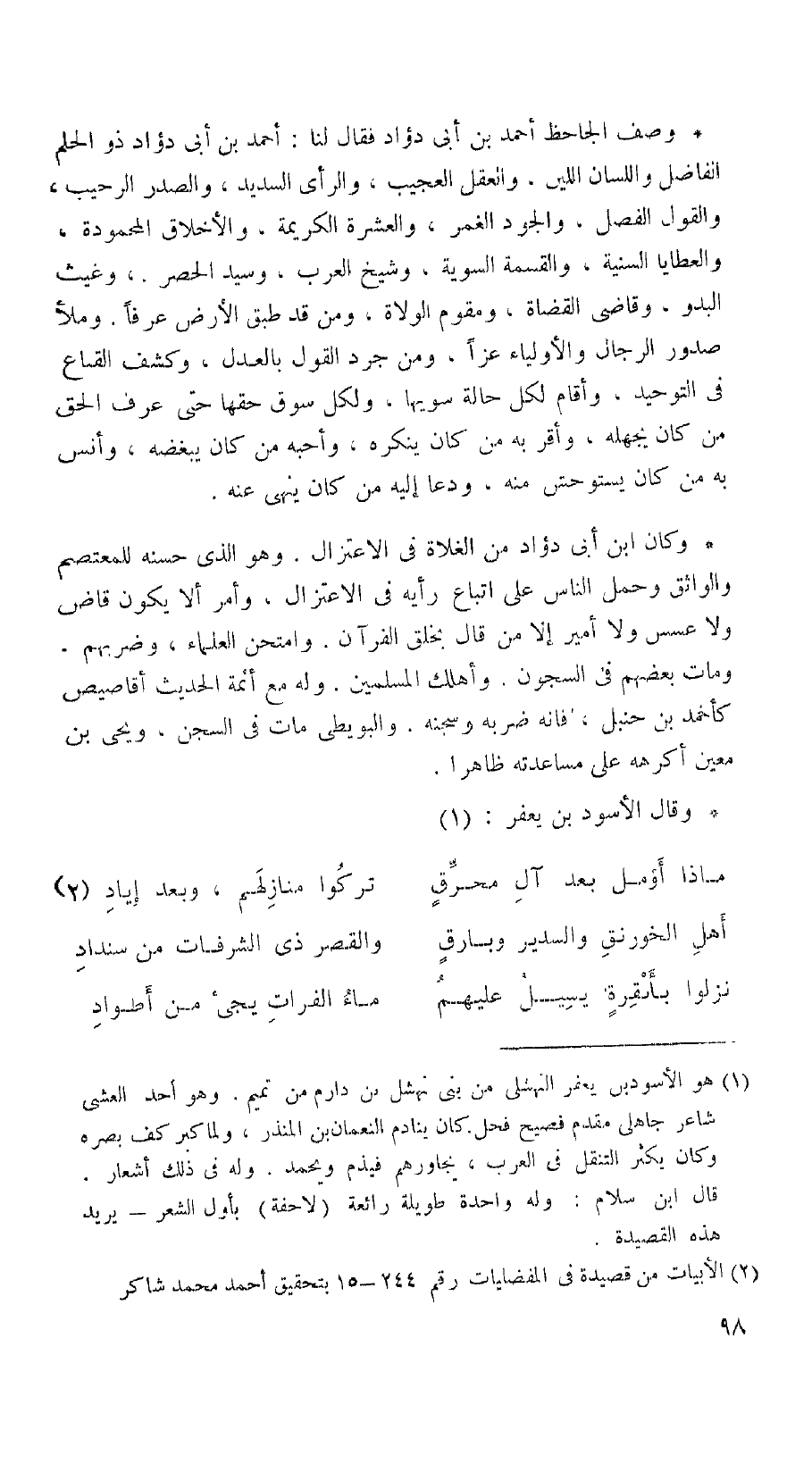وكان ابن أبي دؤاد من الغلاة في الاعتزال. وهو الذي حسنه للمعتصم والواثق وحمل الناس على اتباع رأيه في الاعتزال، وأمر ألا يكون قاض ولا عسس ولا أمير إلا من قال بخلق القرآن. وامتحن العلماء، وضربهم. ومات بعضهم في السجون. وأهلك المسلمين. وله مع أئمة الحديث أقاصيص كأحمد بن حنبل، فانه ضربه وسجنه. والبوطي مات في السجن، ويحيى بن معين أكرهه على مساعدته ظاهرا.