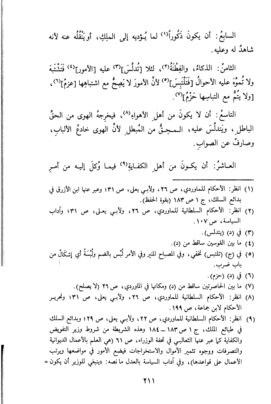الثَّامِن الذكاء والفطنة لِئَلَّا تدلس عَلَيْهِ الْأُمُور فتشتبه وَلَا تموه عَلَيْهِ الْأَحْوَال فتلتبس لِأَن الْأُمُور لَا يَصح مَعَ اشتباهها عزم وَلَا يتم مَعَ التباسها حزم