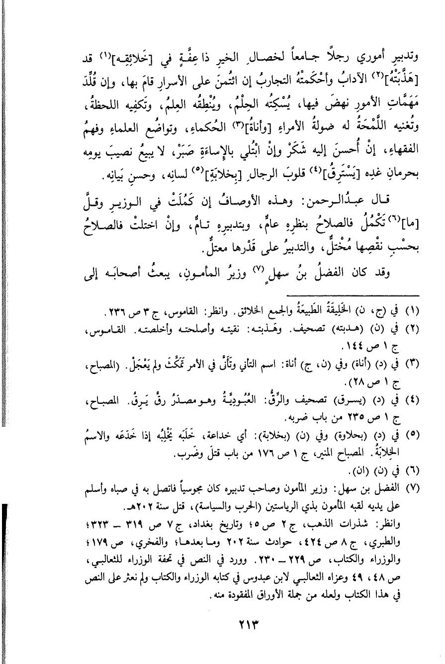 وتدبير أموري رجلا جَامعا لخصال الْخَيْر ذَا عفة فِي خلائقه قد هذبته الْآدَاب وأحكمته التجارب إِن ائْتمن على الْأَسْرَار قَامَ بهَا وَإِن قلد مهمات الْأُمُور نَهَضَ فِيهَا يسكته الْحلم وينطقه الْعلم وَتَكْفِيه اللحظة وتغنيه اللمحة لَهُ صولة الْأُمَرَاء وأناة الْحُكَمَاء وتواضع الْعلمَاء وَفهم الْفُقَهَاء إِن أحسن إِلَيْهِ شكر وَإِن ابْتُلِيَ بالإساءة صَبر لَا يَبِيع نصيب يَوْمه بحرمان غده يسترق قُلُوب الرِّجَال بخلابة لِسَانه وَحسن بَيَانه