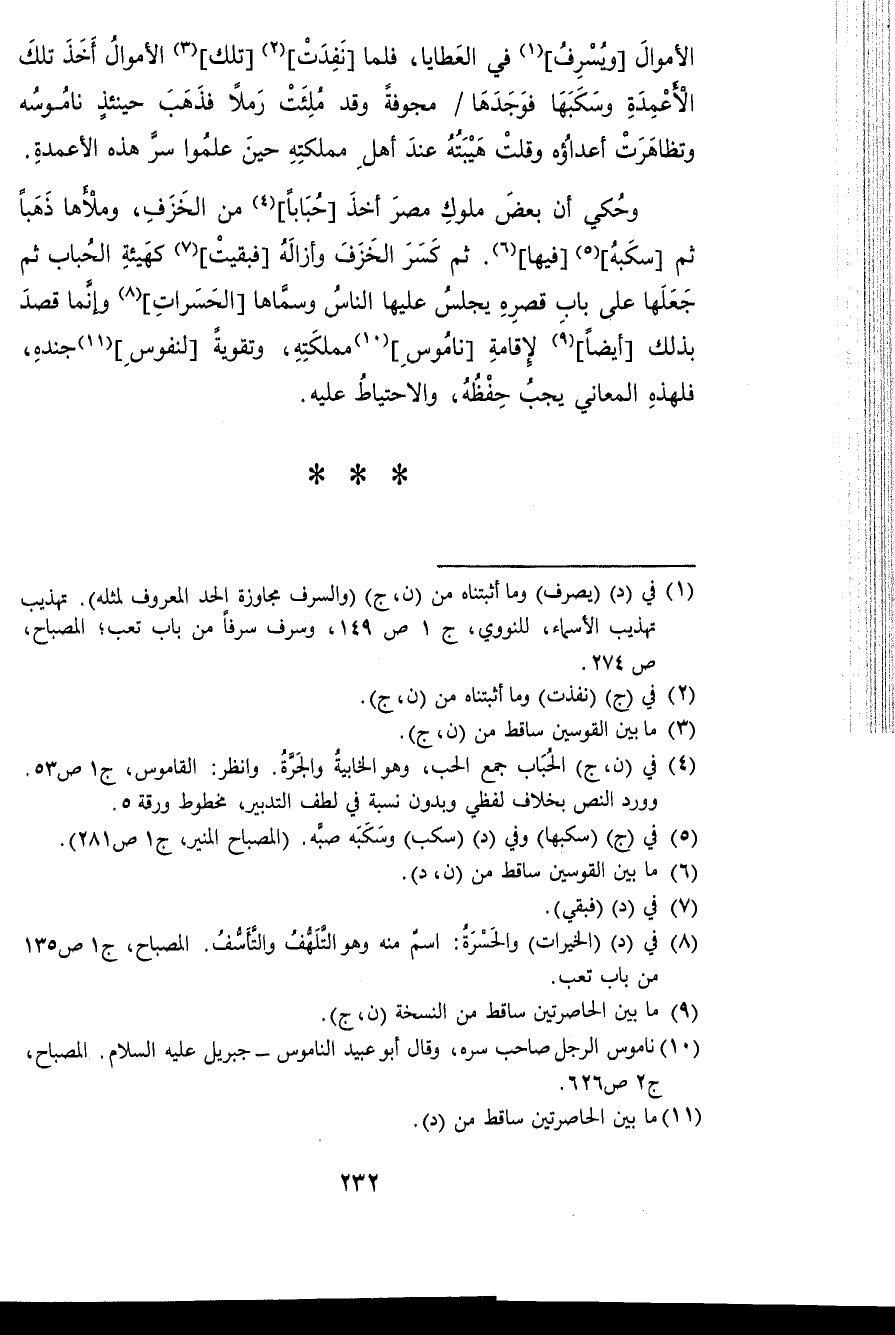 وَحكي أَن بعض مُلُوك مصر أَخذ حبابا من الخزف وملأها ذَهَبا ثمَّ سكبه فِيهَا ثمَّ كسر الخزف وأزاله فَبَقيت كَهَيئَةِ الْحباب ثمَّ جعلهَا على بَاب قصره يجلس عَلَيْهَا النَّاس وسماها الحسرات وَإِنَّمَا قصد بذلك أَيْضا لإِقَامَة ناموس مَمْلَكَته وتقوية لنفوس جنده فلهذه الْمعَانِي يجب حفظه وَالِاحْتِيَاط عَلَيْهِ