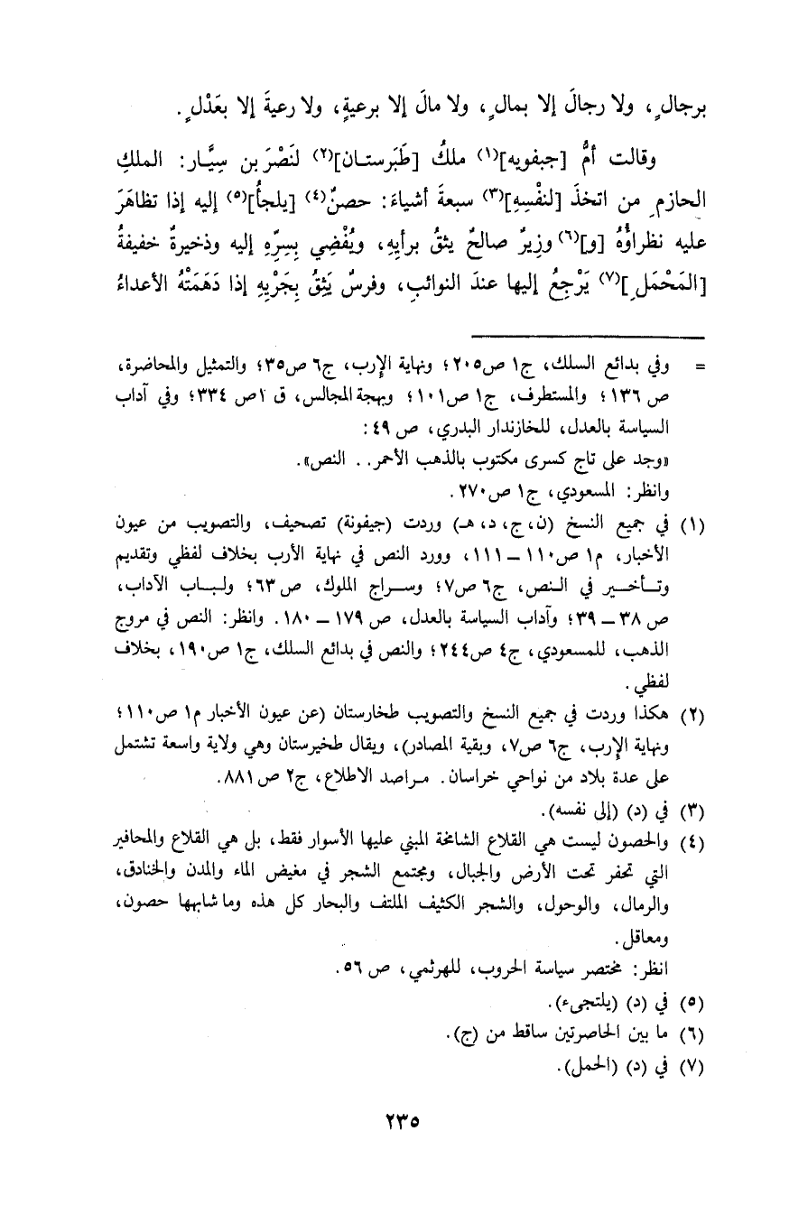 وَقَالَت أم جبفويه ملك طبرستان لنصر بن سيار الْملك الحازم من اتخذ لنَفسِهِ سَبْعَة أَشْيَاء حصن يلجأ إِلَيْهِ إِذا تظاهر عَلَيْهِ نظراؤه ووزير صَالح يَثِق بِرَأْيهِ ويفضي بسره إِلَيْهِ وذخيرة خَفِيفَة الْمحمل يرجع إِلَيْهَا عِنْد النوائب وَفرس يَثِق بجريه إِذا دهمته الْأَعْدَاء