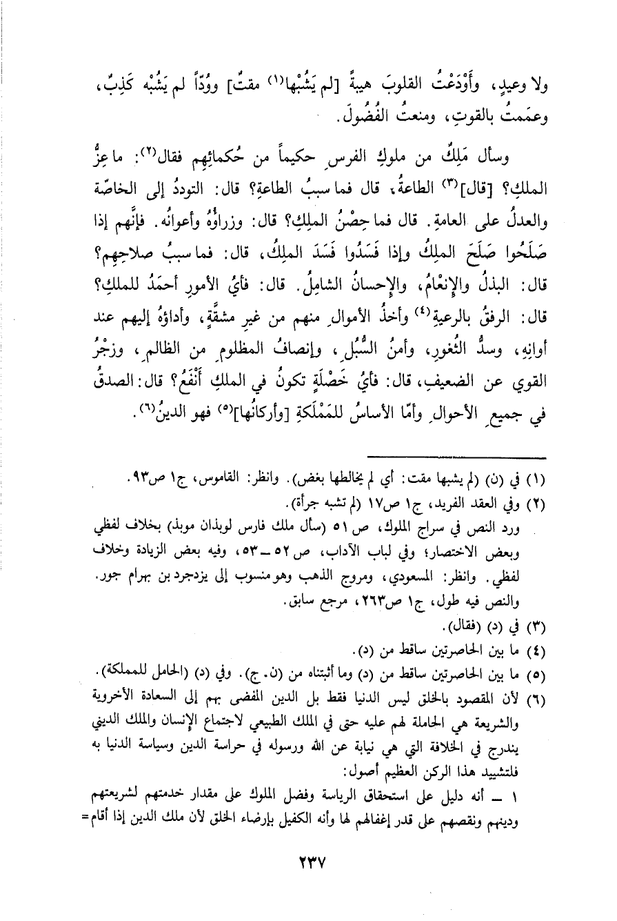 وَسَأَلَ ملك من مُلُوك الْفرس حكيما من حكمائهم فَقَالَ مَا عز الْملك قَالَ الطَّاعَة قَالَ فَمَا سَبَب الطَّاعَة قَالَ التودد إِلَى الْخَاصَّة وَالْعدْل على الْعَامَّة قَالَ فَمَا حصن الْملك قَالَ وزراؤه وأعوانه فَإِنَّهُم إِذا صلحوا صلح الْملك وَإِذا فسدوا فسد الْملك قَالَ فَمَا سَبَب صَلَاحهمْ قَالَ الْبَذْل والإنعام وَالْإِحْسَان الشَّامِل قَالَ فَأَي الْأُمُور أَحْمد للْملك قَالَ الرِّفْق بالرعية وَأخذ الْأَمْوَال مِنْهُم من غير مشقة وأداؤه إِلَيْهِم عِنْد أَوَانه وسد الثغور وَأمن السبل وإنصاف الْمَظْلُوم من الظَّالِم وزجر الْقوي عَن الضَّعِيف قَالَ فَأَي خصْلَة تكون فِي الْملك أَنْفَع قَالَ الصدْق فِي جَمِيع الْأَحْوَال وَأما الأساس للمملكة وأركانها فَهُوَ الدّين