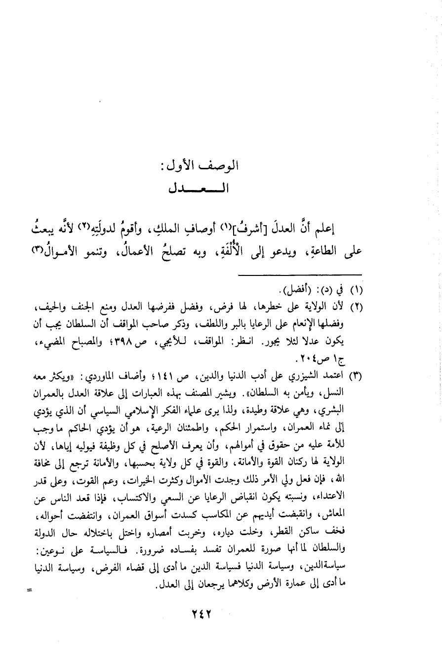 إعلم أَن الْعدْل أشرف أَوْصَاف الْملك وأقوم لدولته لِأَنَّهُ يبْعَث على الطَّاعَة ويدعوا إِلَى الألفة وَبِه تصلح الْأَعْمَال وتنمو الْأَمْوَال