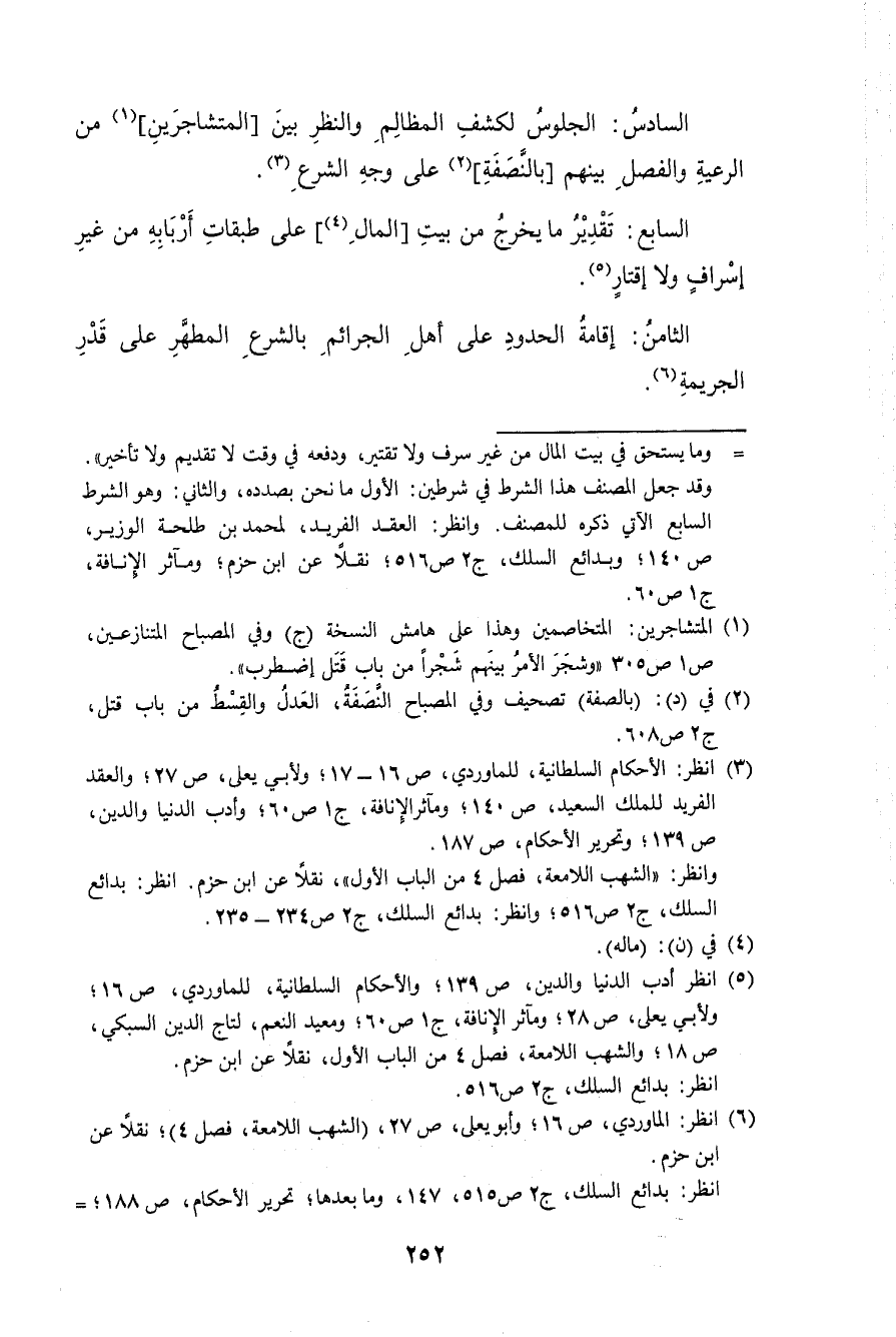 السَّادِس الْجُلُوس لكشف الْمَظَالِم وَالنَّظَر بَين المتشاجرين من الرّعية والفصل بَينهم بالنصفة على وَجه الشَّرْع